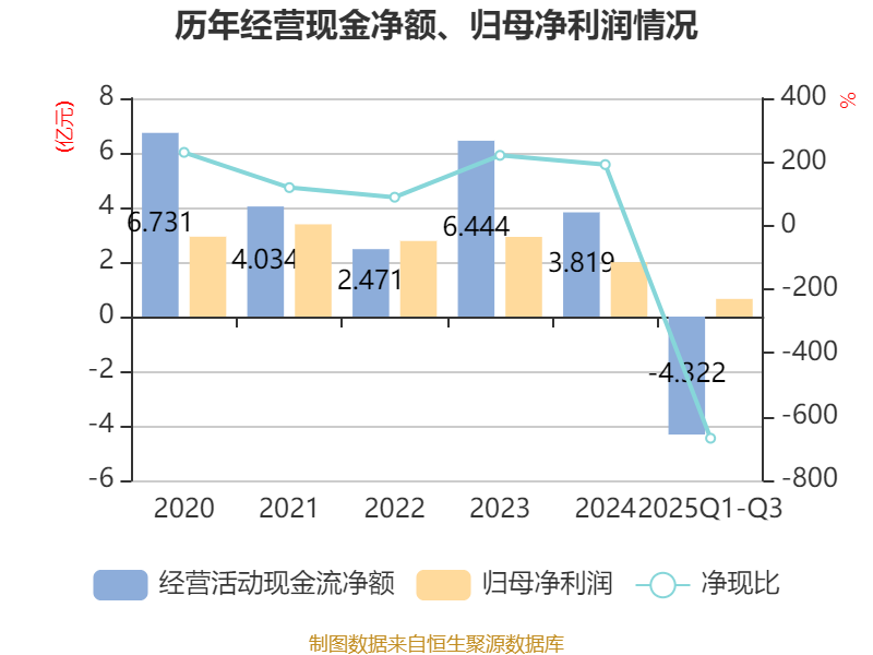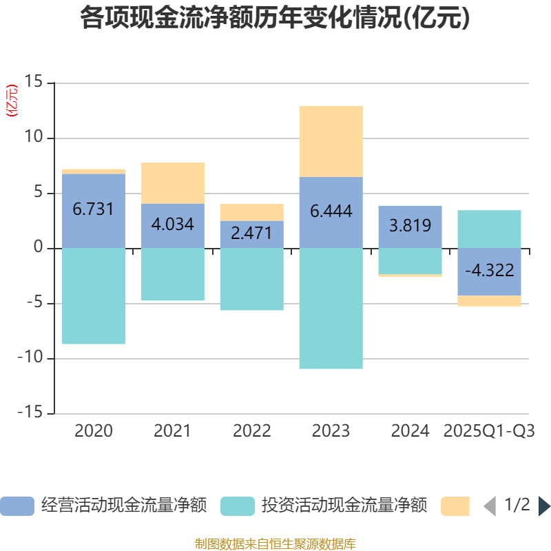 2025年前三季度,公司经营活动现金流净额为-4.32亿元,同比减少2.21亿元;筹资活动现金流净额-9792.93万元,同比增加6432.37万元;投资活动现金流净额3.42亿元,上年同期为2.5亿元。