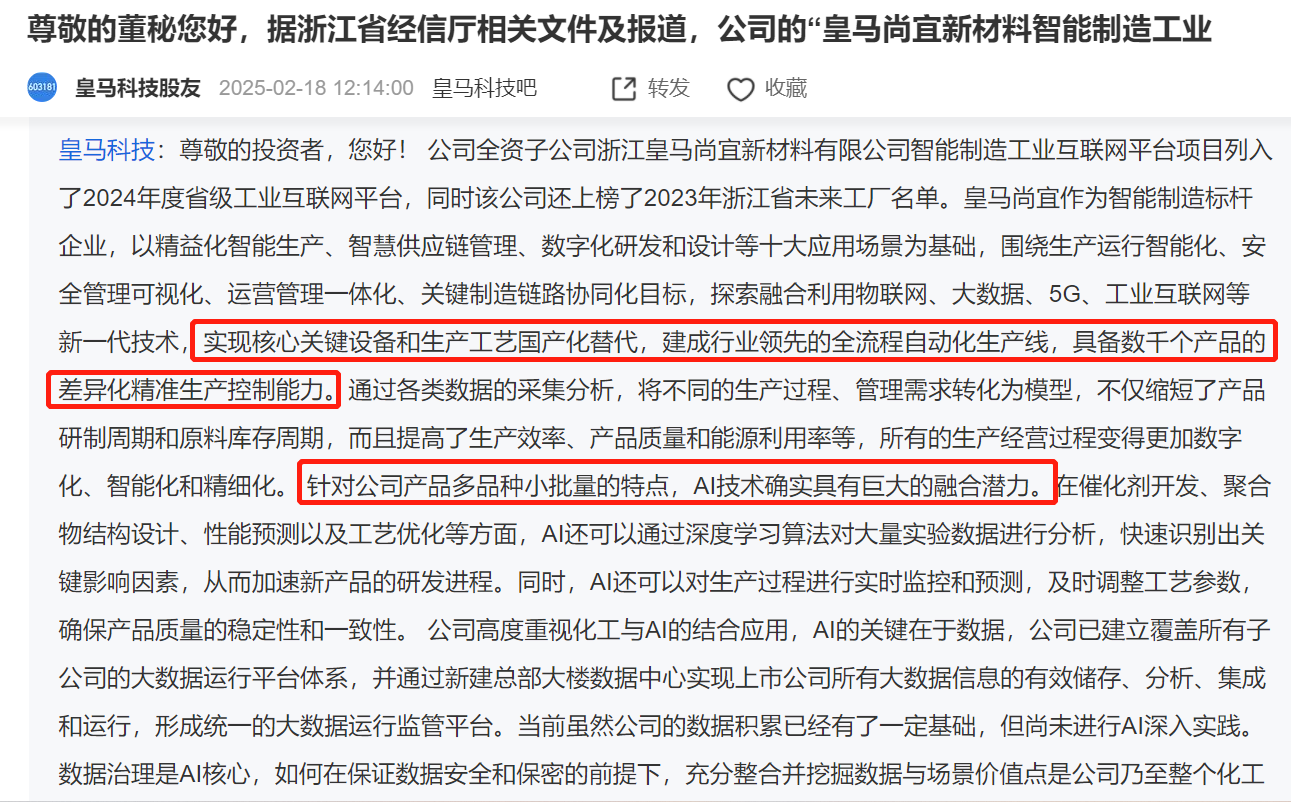皇马科技互动回复提到,公司产品多品种小批量的特点,AI技术确实具有巨大的融合潜力。在催化剂开发、聚合物结构设计、性能预测以及工艺优化等方面,AI还可以通过深度学习算法对大量实验数据进行分析,快速识别出关键影响因素,从而加速新产品的研发进程。