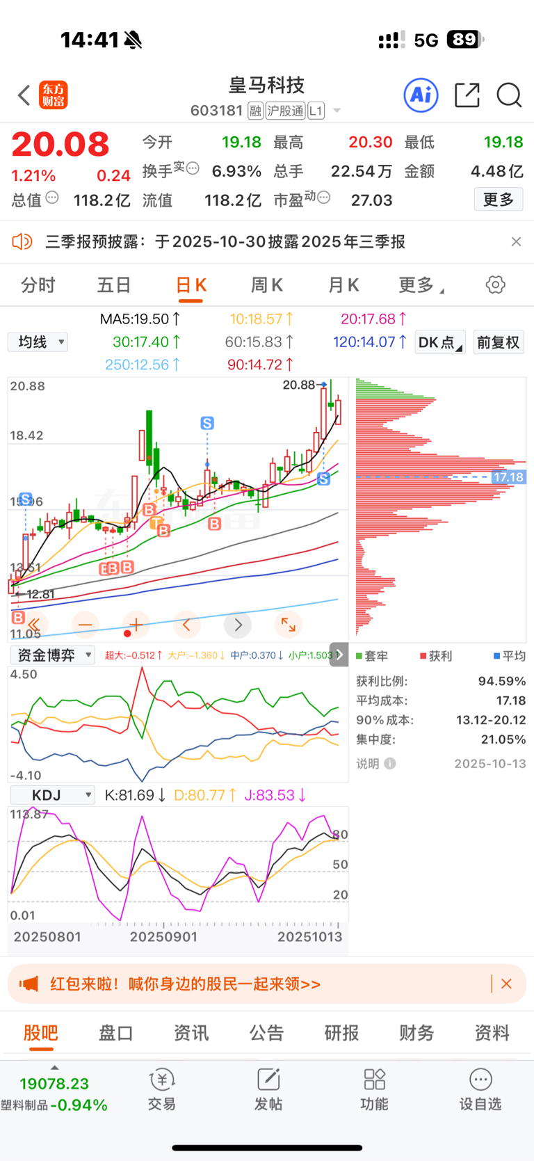 $皇马科技(SH603181)$ 这支股做了俩月没事t一下平时不咋看,上周清的,未来再买回来,应该还是保持上涨趋势逢缺必补,现在就怕之前减持的人到时候直接走大宗走完接着减或者别人也减那就很恶心了,祝大家好运。