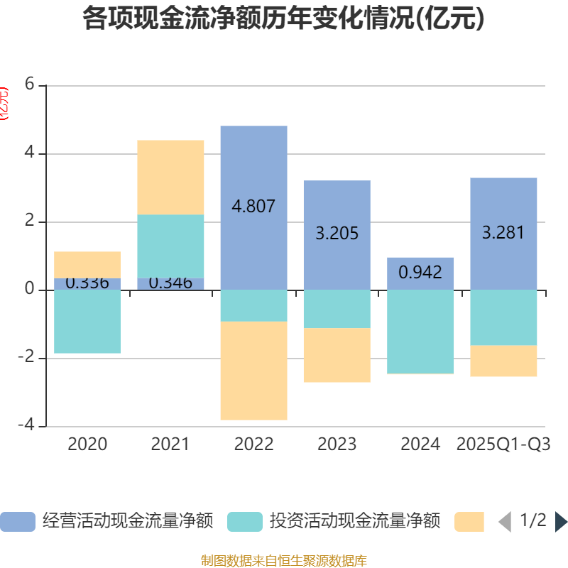 2025年前三季度,公司经营活动现金流净额为3.28亿元,同比增长498.89%;筹资活动现金流净额-9105.95万元,同比减少9405.67万元;投资活动现金流净额-1.64亿元,上年同期为-1.03亿元。