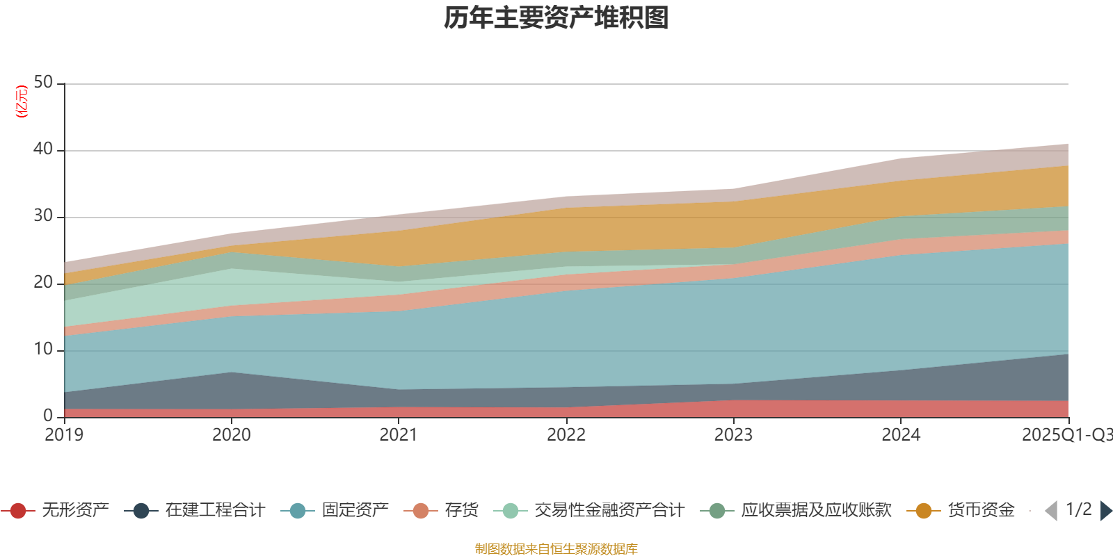 资产重大变化方面,截至2025年三季度末,公司在建工程合计较上年末增加54.86%,占公司总资产比重上升5.46个百分点;固定资产较上年末减少4.1%,占公司总资产比重下降4.1个百分点;存货较上年末减少16.95%,占公司总资产比重下降1.32个百分点;货币资金较上年末增加14.1%,占公司总资产比重上升1.1个百分点。