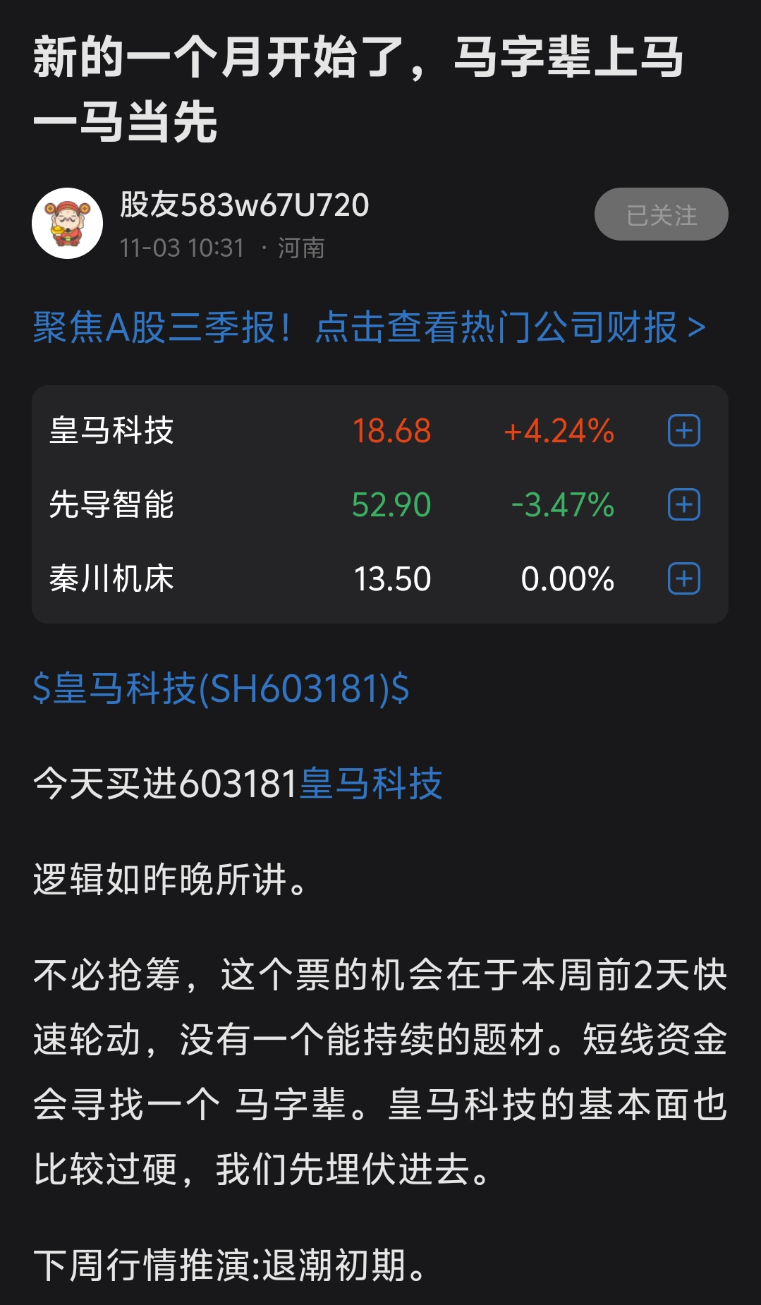 $皇马科技(SH603181)$ 周二的皇马科技收涨4.24%,,市场选择了 神马 天马 万里马 福龙马。。A股共有29个马字辈,如果轮动首领的福建板块周三转跌,马字辈有爆发的机会。