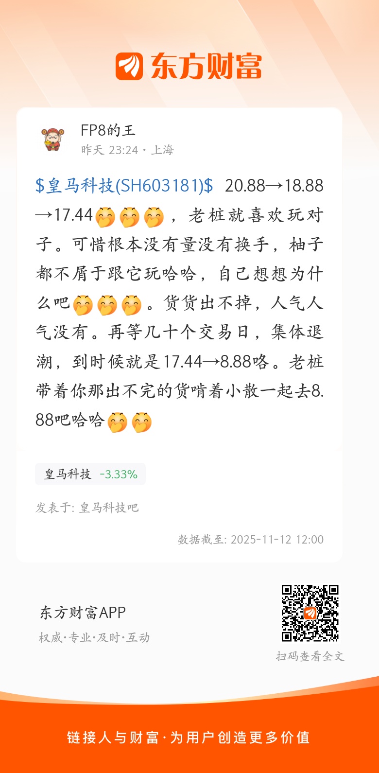 $皇马科技(SH603181)$ 20.88→18.88→17.44