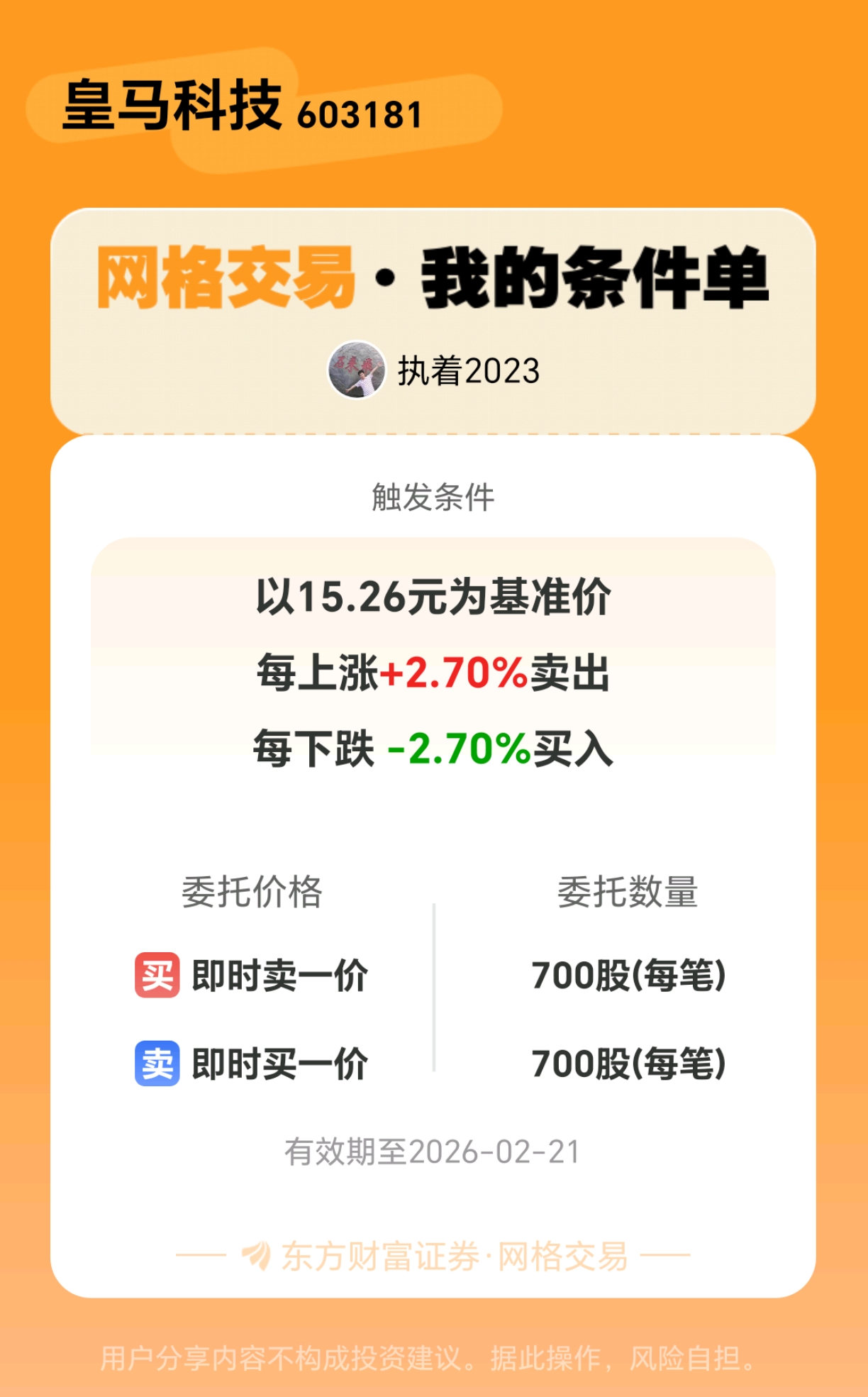 #条件单交流# #网格交易晒单# 一位股神设置了一个网格交易条件单,接下来就是见证奇迹的时刻~$皇马科技(SH603181)$