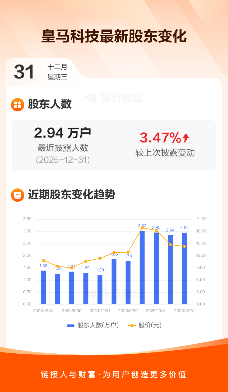 皇马科技:截至12月31日最新股东户数2.94万户,较上期增加3.47%