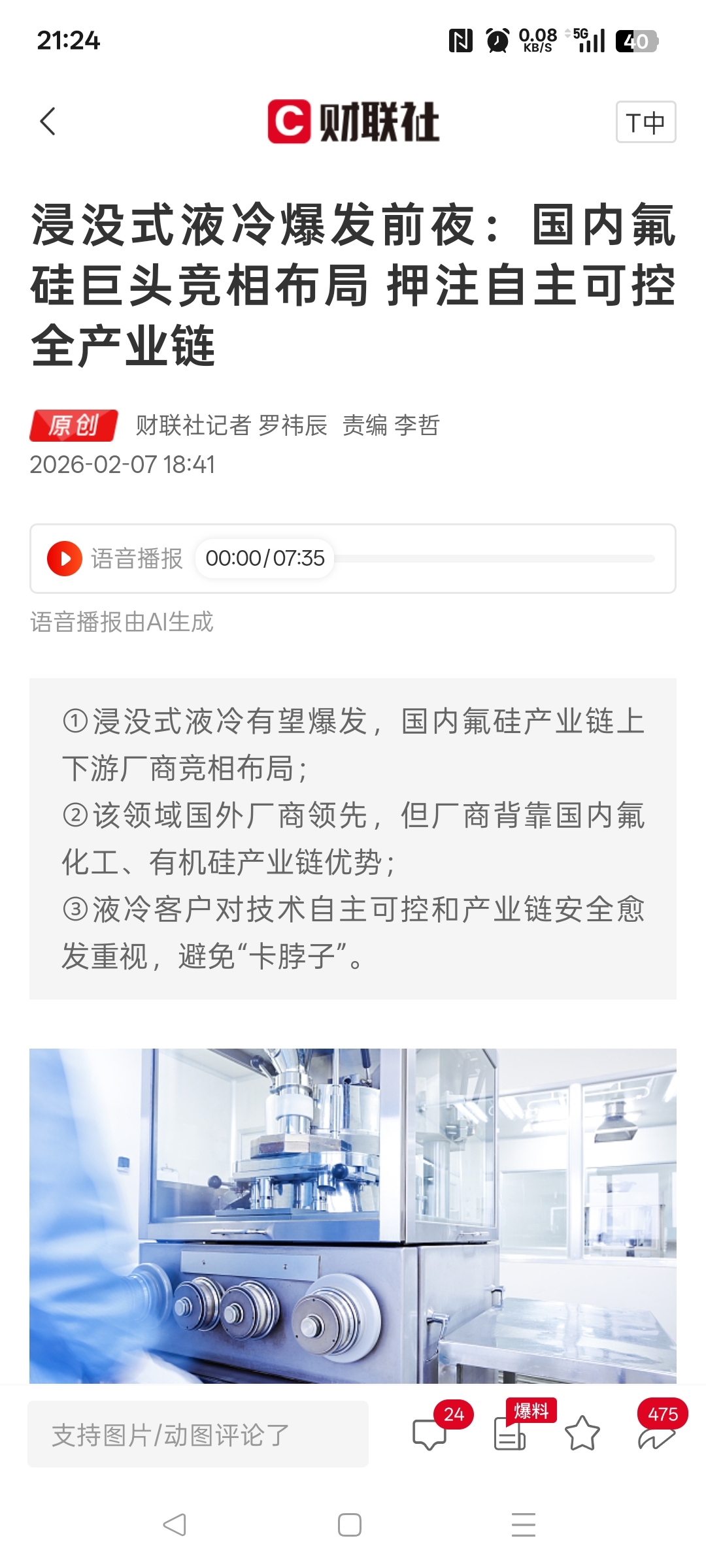 $皇马科技(SH603181)$ 财联社头条氟冷硅冷,皇马科技才是双产业全链龙头!