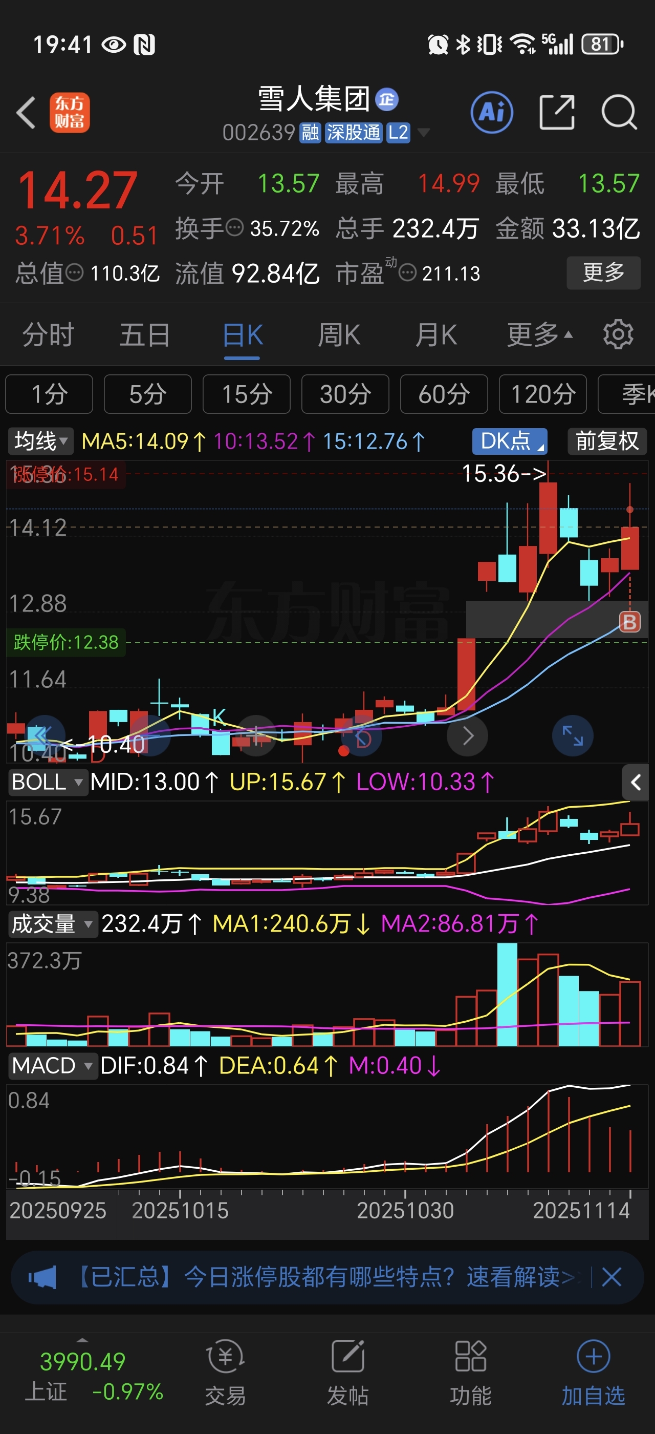 今天这个大盘是杀猪盘,昨天涨0.7今天就跌一个点,很多都杀跌我是开板砸了雪人以为