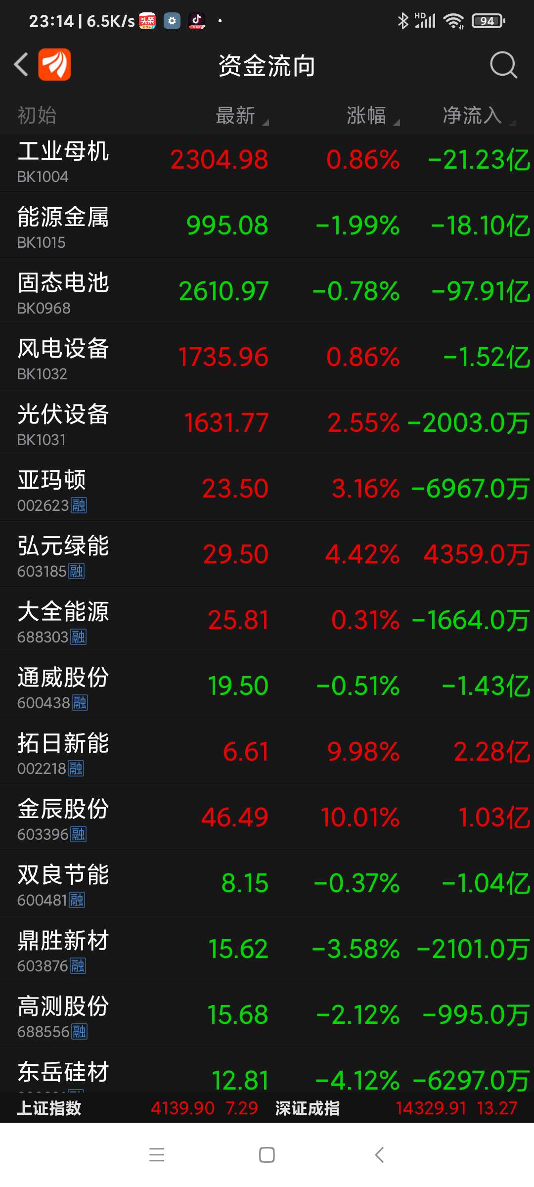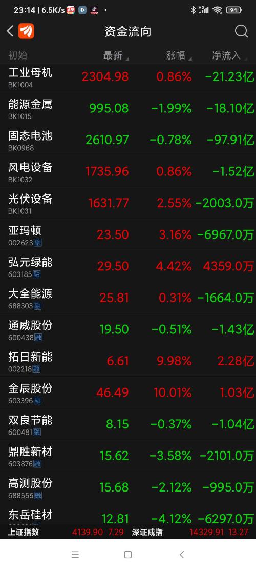 今日弘元绿能等八股,资金净流入一览。