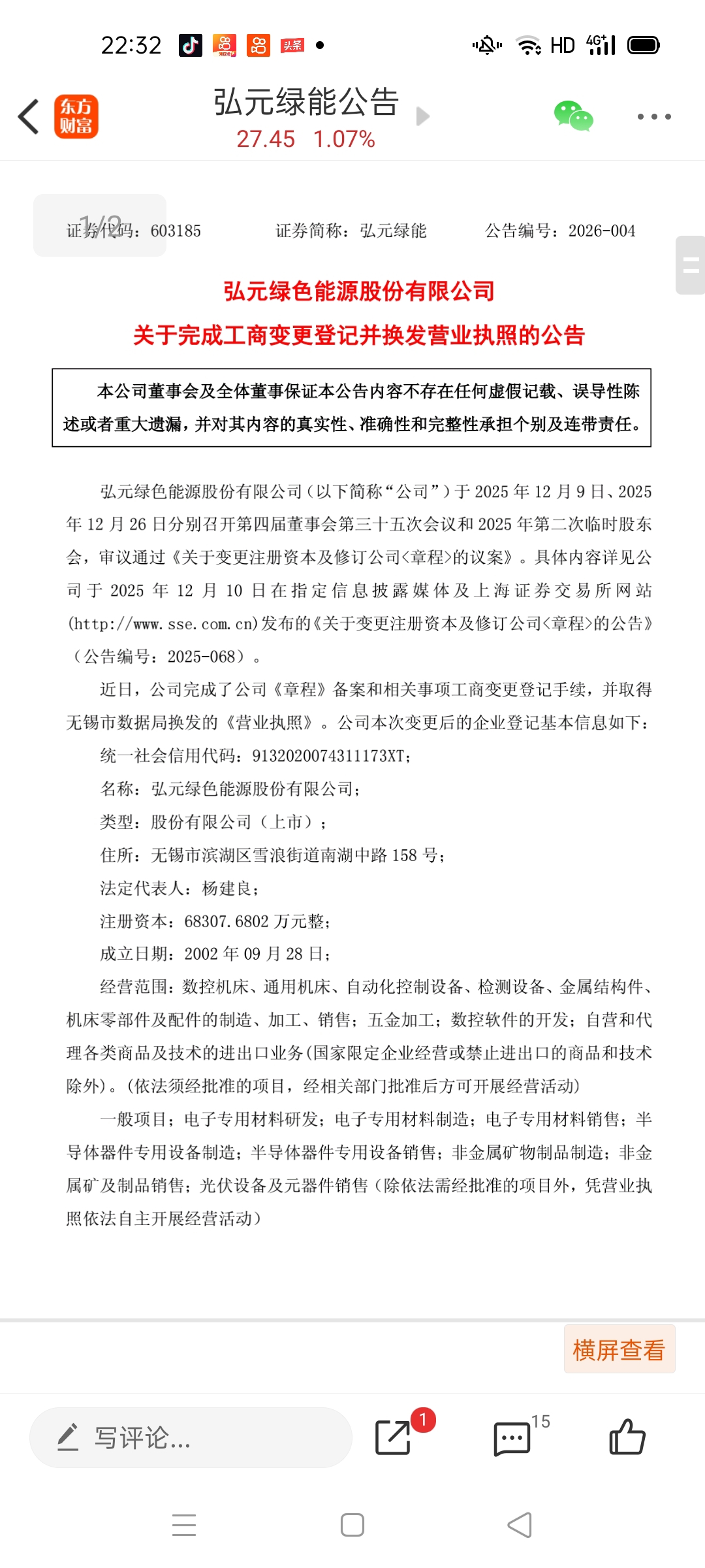 $弘元绿能(SH603185)$ 明天涨停,卡住马斯克太空光伏脖子就是这个光伏超薄切割设备,营业执照里面还有半导体设备,这股票严重低估,虽然董秘不会市值管理,但金子藏不住耀眼的光芒,我就帮他维护已一下。