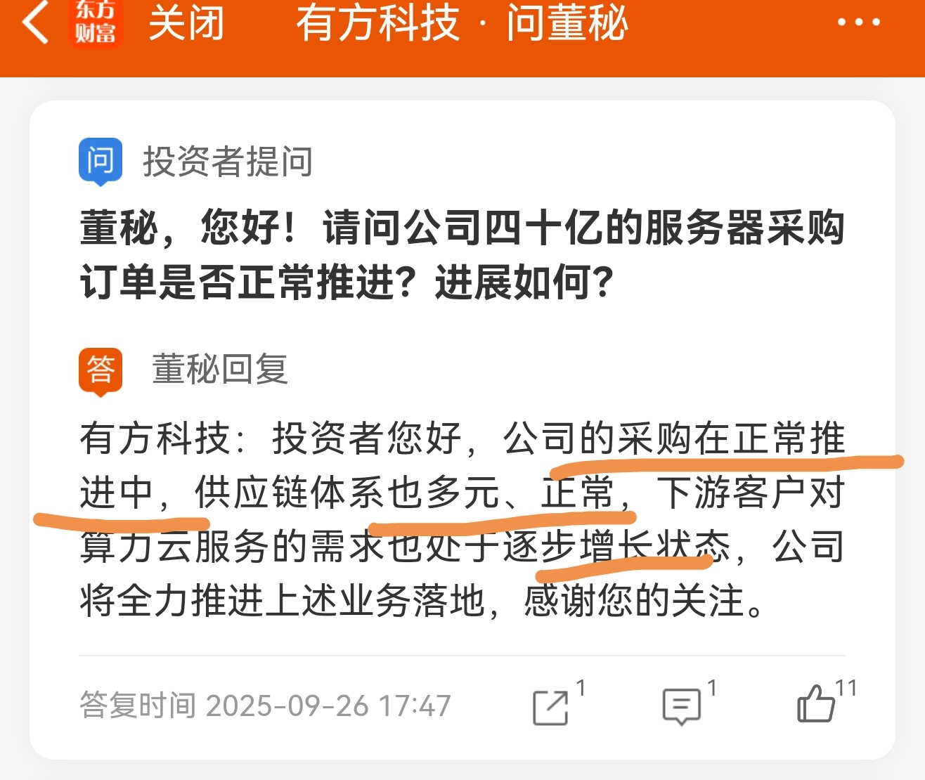 最近有方科技走势不佳,最大因素,和jg筹码有关!jg高抛低吸水平确实很牛!高阶nv卡按公开信息,这个月到货没悬念,只是小批量还是大批量的问题!只要到货,海南华铁的影响就彻底消除!董秘敢在926回复正常进行,那一定到货没问题!