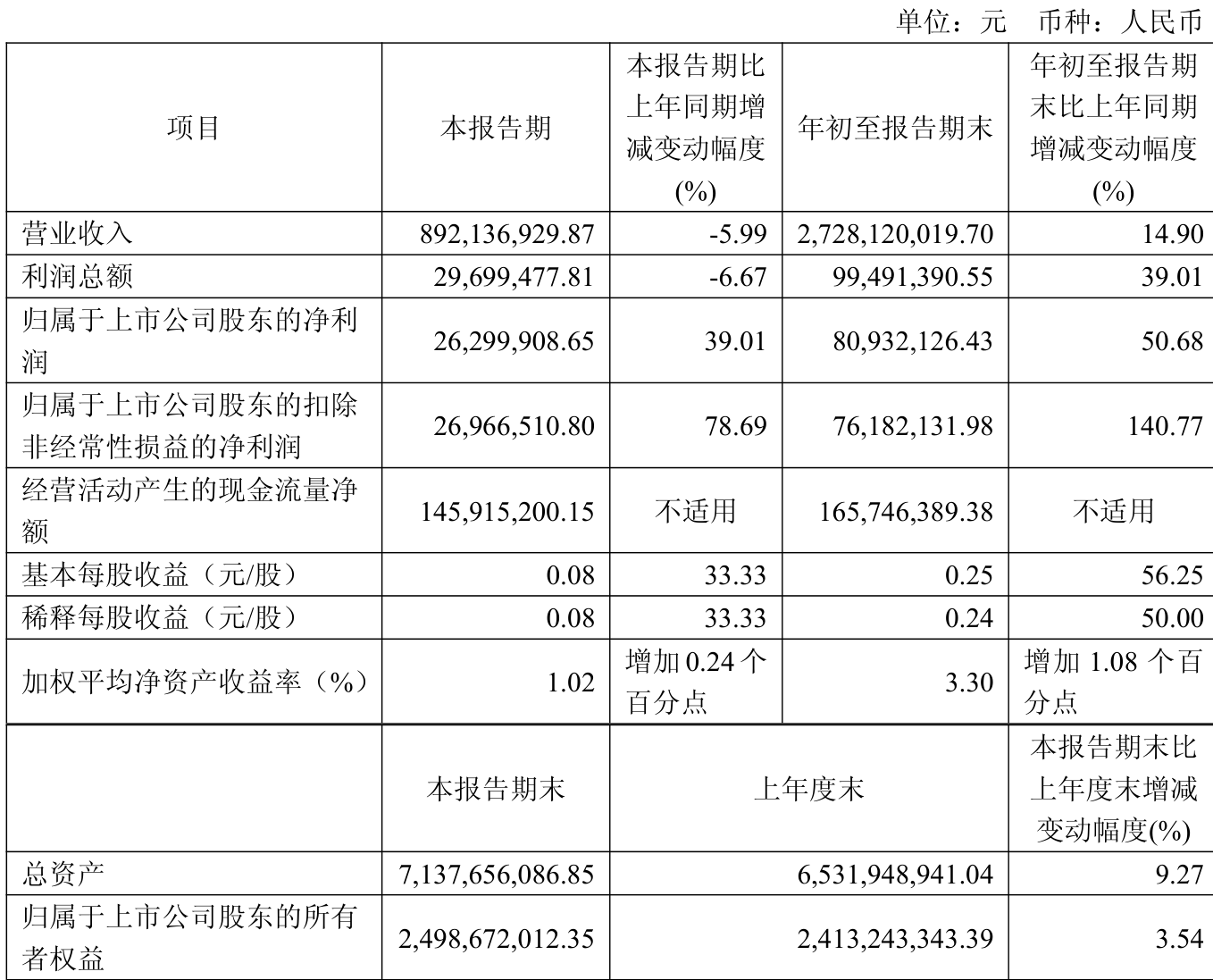 中证智能财讯望变电气(603191)10月30日披露2025年第三季度报告。前三季度公司实现营业总收入27.28亿元,同比增长14.90%;归母净利润8093.21万元,同比增长50.68%;扣非净利润7618.21万元,同比增长140.77%;经营活动产生的现金流量净额为1.66亿元,上年同期为-3.64亿元;报告期内,望变电气基本每股收益为0.25元,加权平均净资产收益率为3.30%。