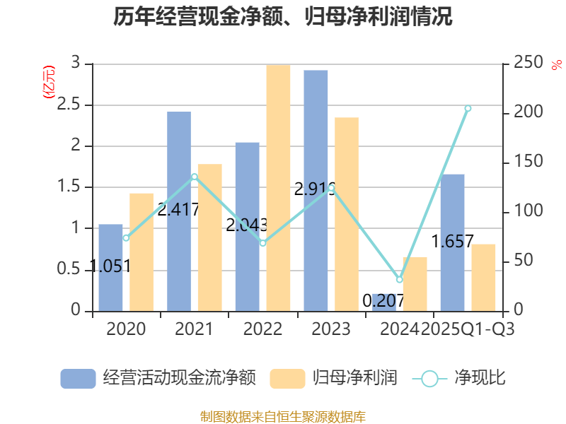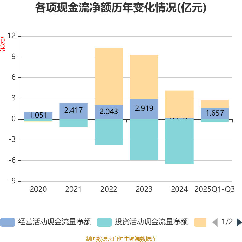 2025年前三季度,公司经营活动现金流净额为1.66亿元,同比增加5.3亿元;筹资活动现金流净额1.18亿元,同比减少4.4亿元;投资活动现金流净额-3478.43万元,上年同期为-5.45亿元。