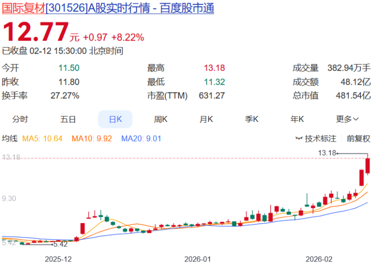 国际复材报收12.77元,日涨幅8.22%,列第二,换手率%,今年以来的涨幅为82.43%,为渝股第一。