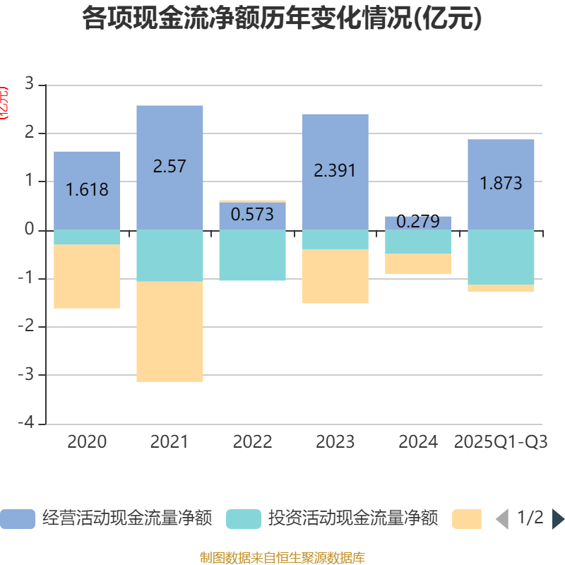 2025年前三季度,公司经营活动现金流净额为1.87亿元,同比增加2.86亿元;筹资活动现金流净额-1449.6万元,同比增加4496.33万元;投资活动现金流净额-1.13亿元,上年同期为-4951.72万元。