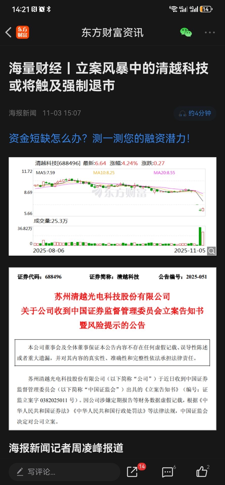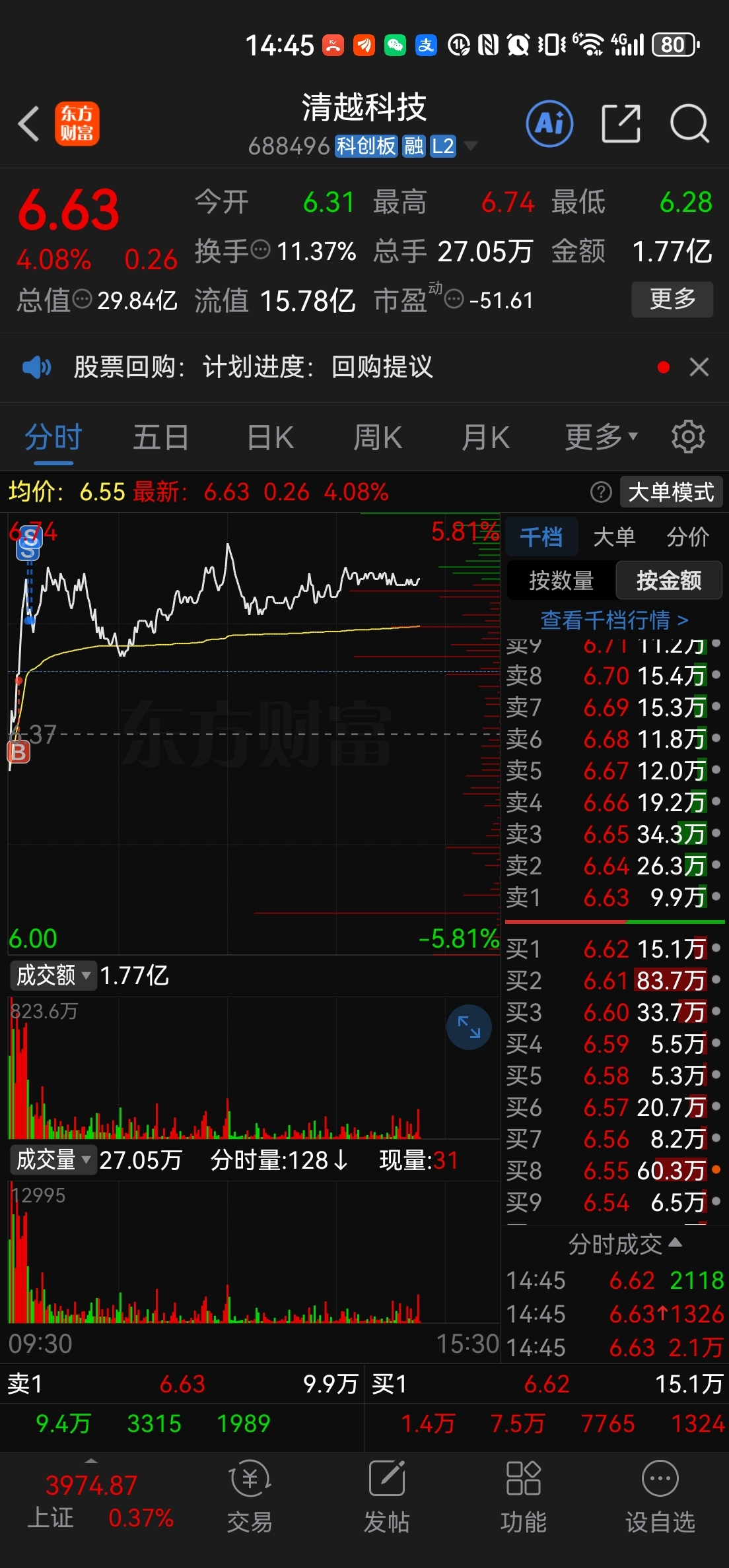 清越科技,也是跌了30%,今天拉起来了,最高六个点左右吧。这个汇得科技基本面,怎