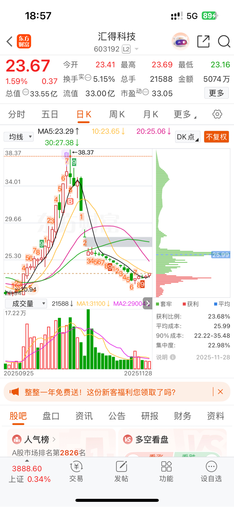 $汇得科技(SH603192)$ 汇得哥,我亏1w走的,今天又进来了,给点力行吗