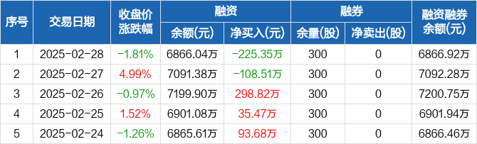 润本股份:融资净偿还225.35万元,融资余额6866.04万元(02-28)