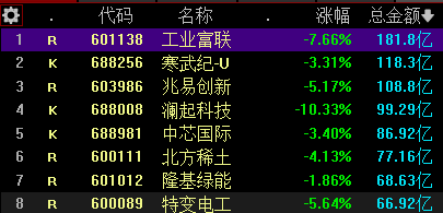 两市 成交金额排名靠前 的 8大股票,都出现 较大幅度放量下跌。