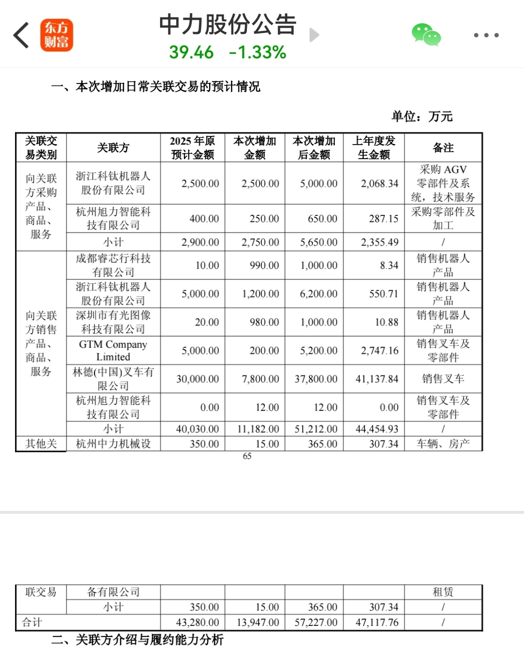 $中力股份(SH603194)$ 那个公告啥也别看,就看这张图就好了。简单说,就是四季度要加大机器人销售,所以对关联企业的AGV采购,和机器人销售,关联交易金额进行了大幅度的修改。还有就是林德四季度要加大采购量了,关联交易限额增加了7800万元,这都是四季度的增量。为什么要做这些修改,估计是双11根据签约订单做的修改。中力机器人要开始发力了