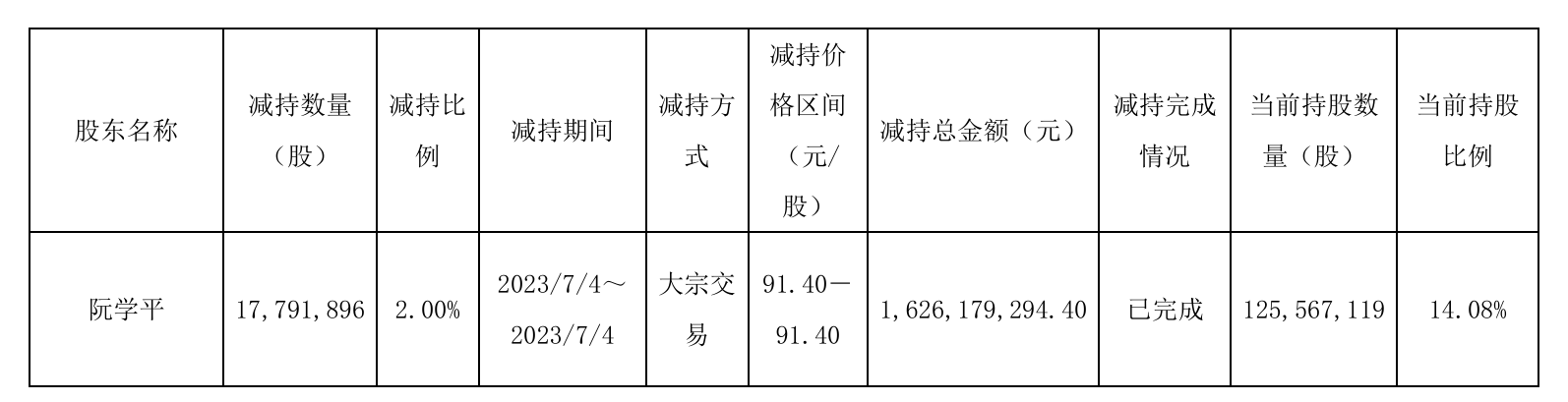 早在2023年7月,阮学平就曾通过大宗交易方式减持公牛集团,减持总金额约16.26亿元。