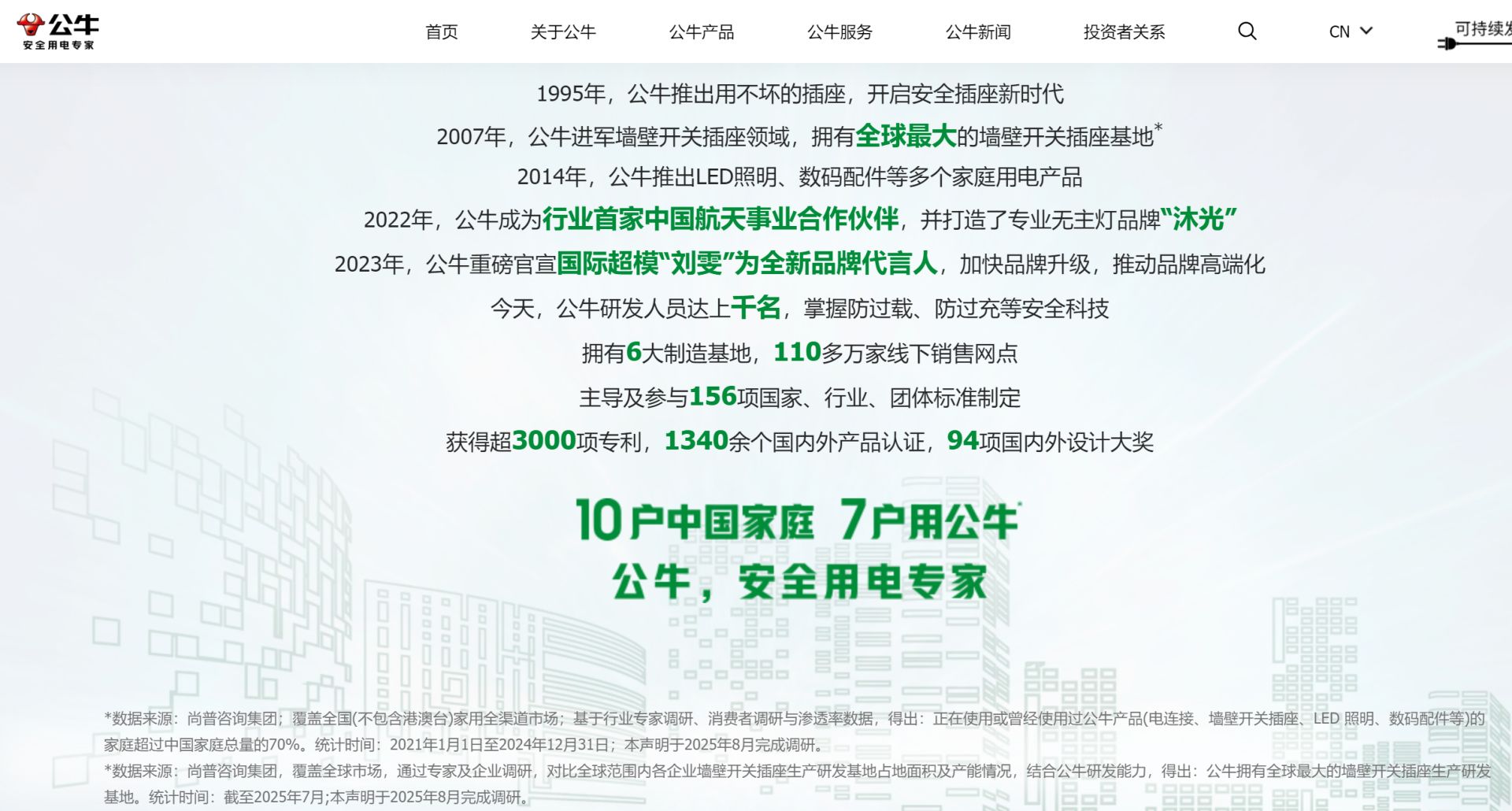 打开公牛集团官网,可以明显看到其经典广告语“10户中国家庭,7户用公牛”,并特意将数字“10”和“7”字号放大,以此强化突出效果。