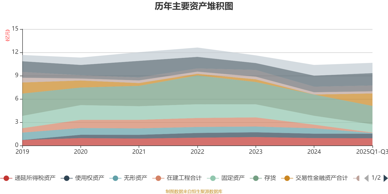 资产重大变化方面,截至2025年三季度末,公司交易性金融资产合计占公司总资产的15.08%,上年末为0;无形资产较上年末减少88.63%,占公司总资产比重下降6.03个百分点;存货较上年末减少12.87%,占公司总资产比重下降3.98个百分点;在建工程合计较上年末减少86.6%,占公司总资产比重下降3.85个百分点。