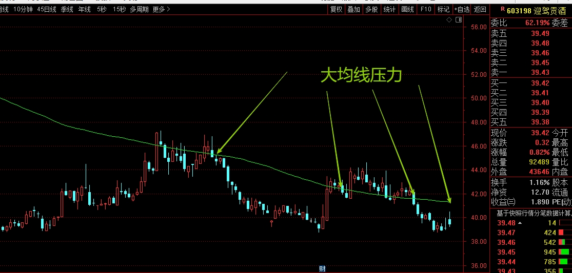 $迎驾贡酒(SH603198)$ 中期走势较弱毋庸置疑的,整个板块都这样,这种形态下,基本不考虑参与,每一次反弹起来,大均线都是压力位,所以接下来什么时候拉升起来站稳大均线,并且斜率略微向上,那就可以考虑介入了。#炒股日记# #收盘点评#