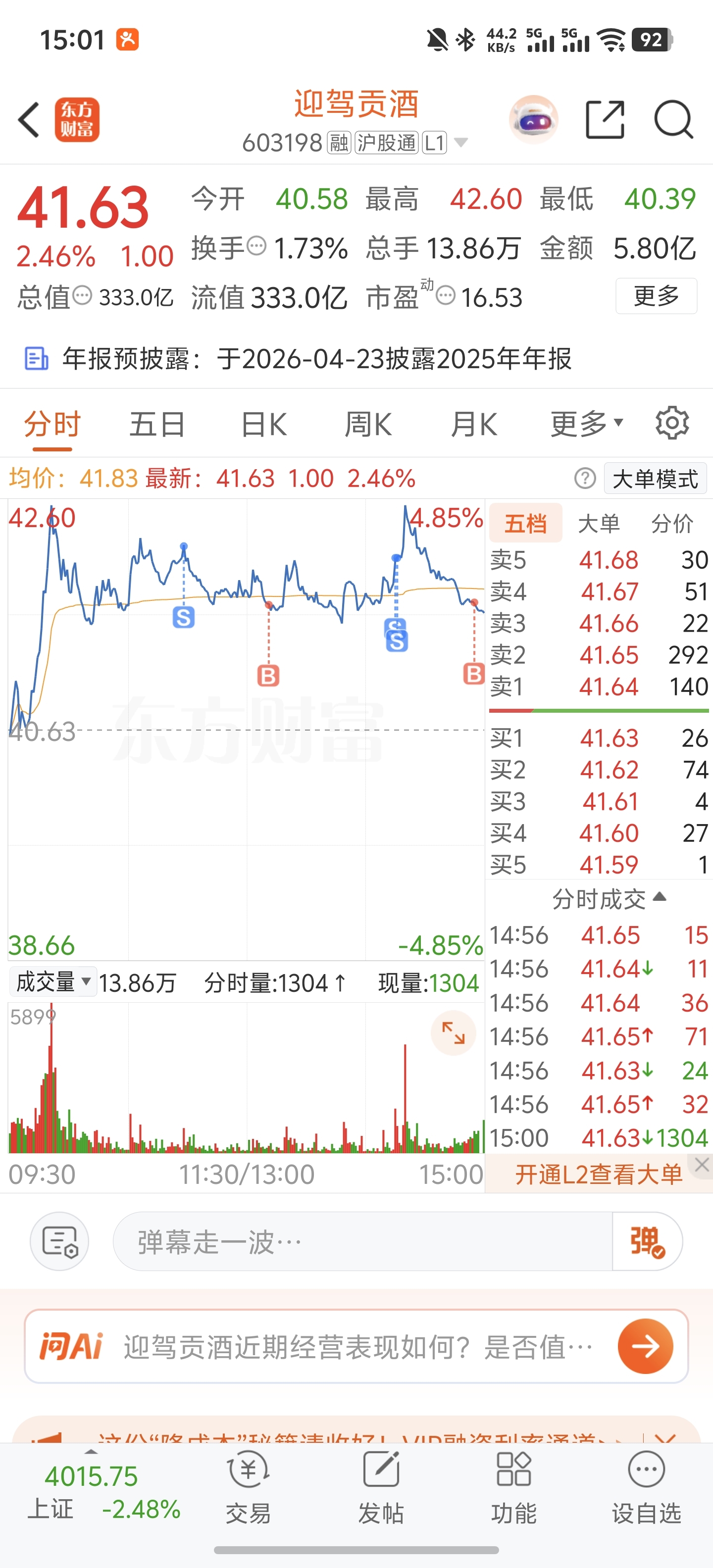 $迎驾贡酒(SH603198)$ 承认你冲上去的时候有点小慌。明天不动了,能冲前高43吗?还是接着42来回摩擦