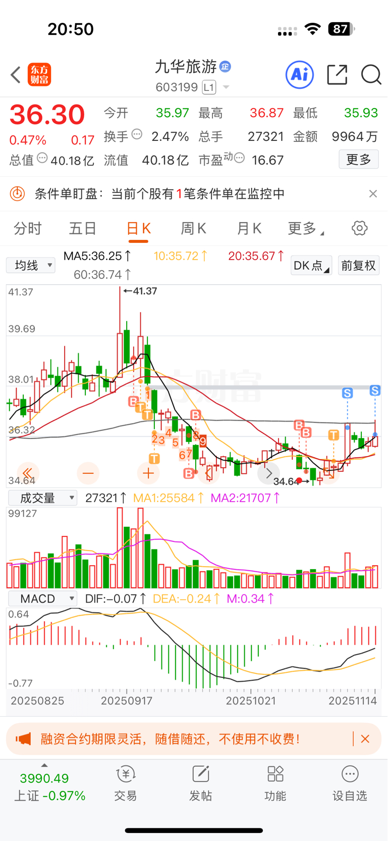 $九华旅游(SH603199)$ 真不知道业绩好有啥用啊算了走了