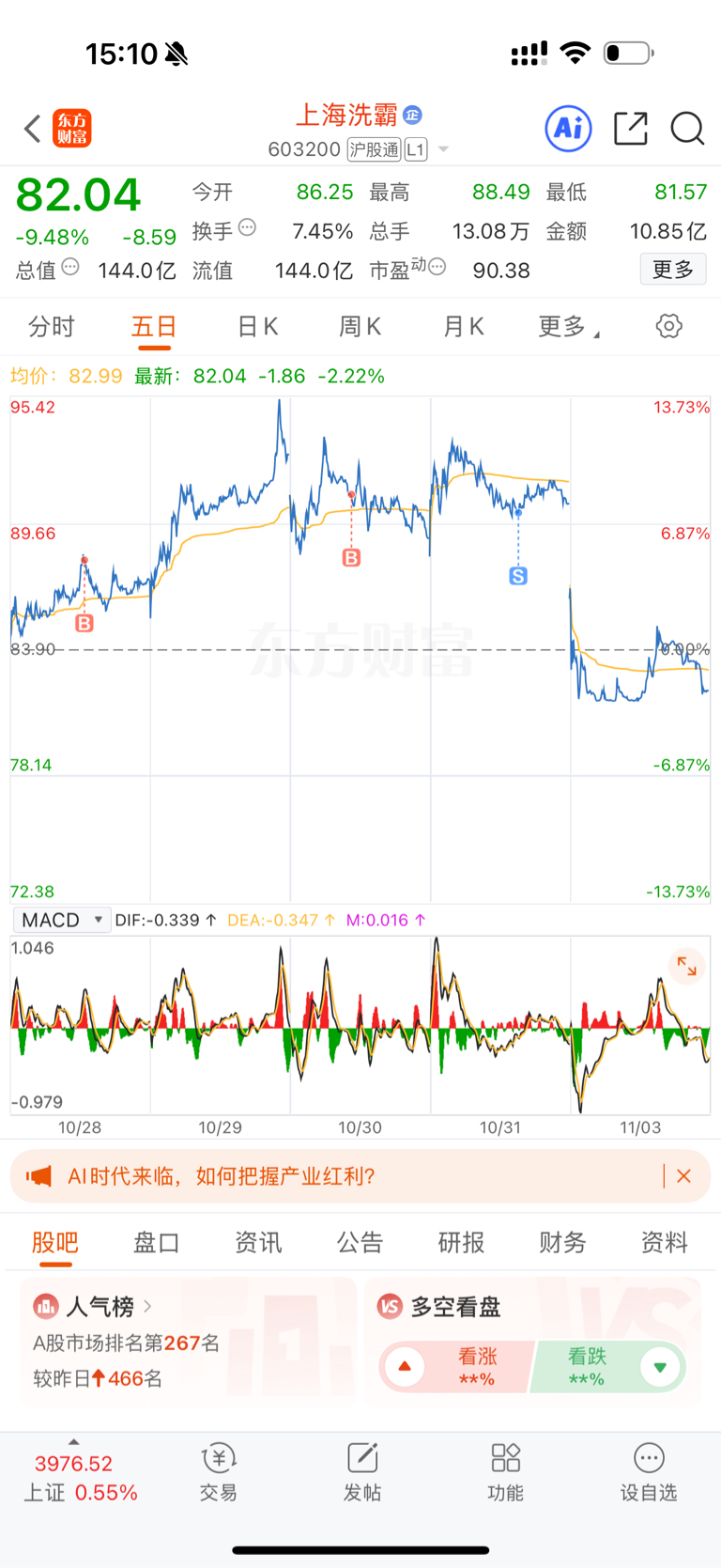 $上海洗霸(SH603200)$ 今天一看吓死人,还好周五清仓了