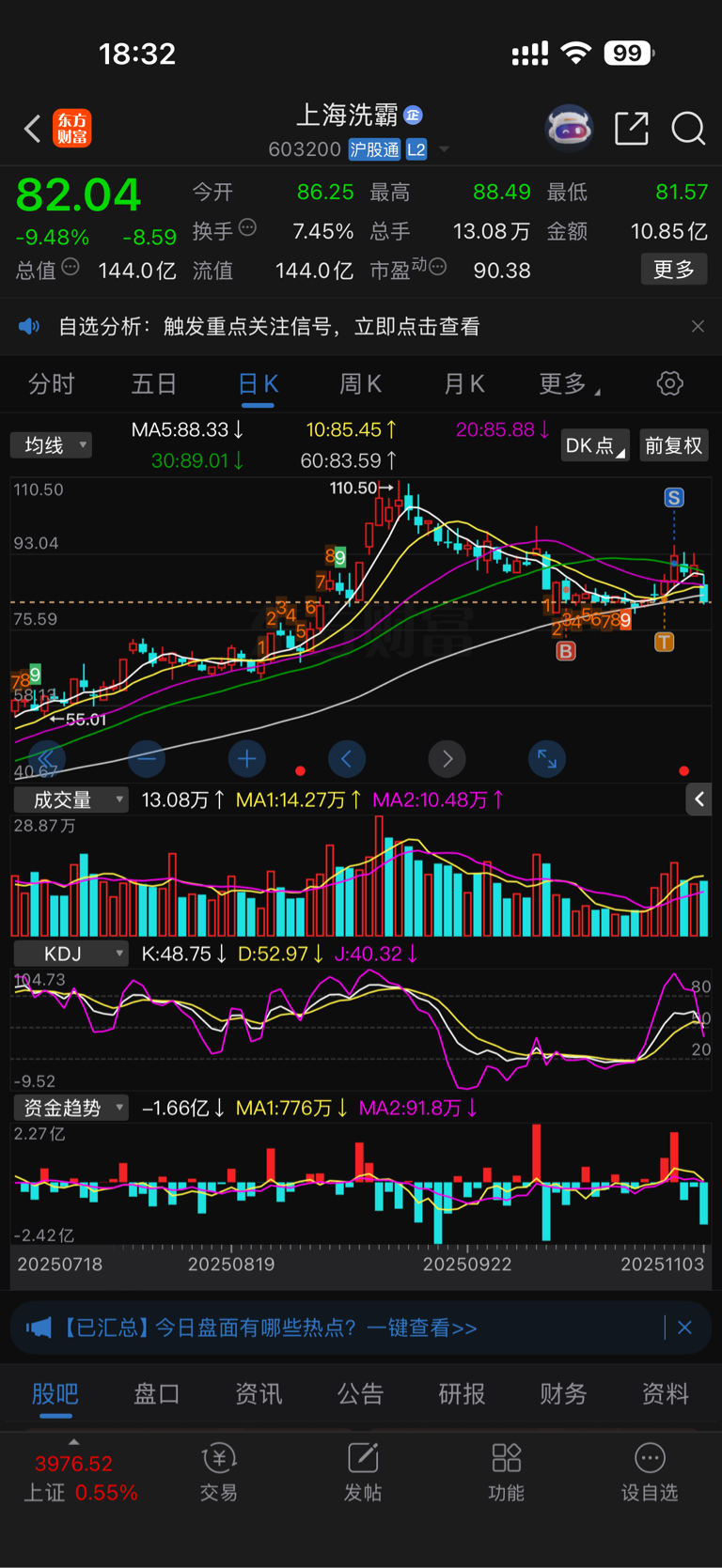 $上海洗霸(SH603200)$ 幸亏跑得快,跌倒70我就回来