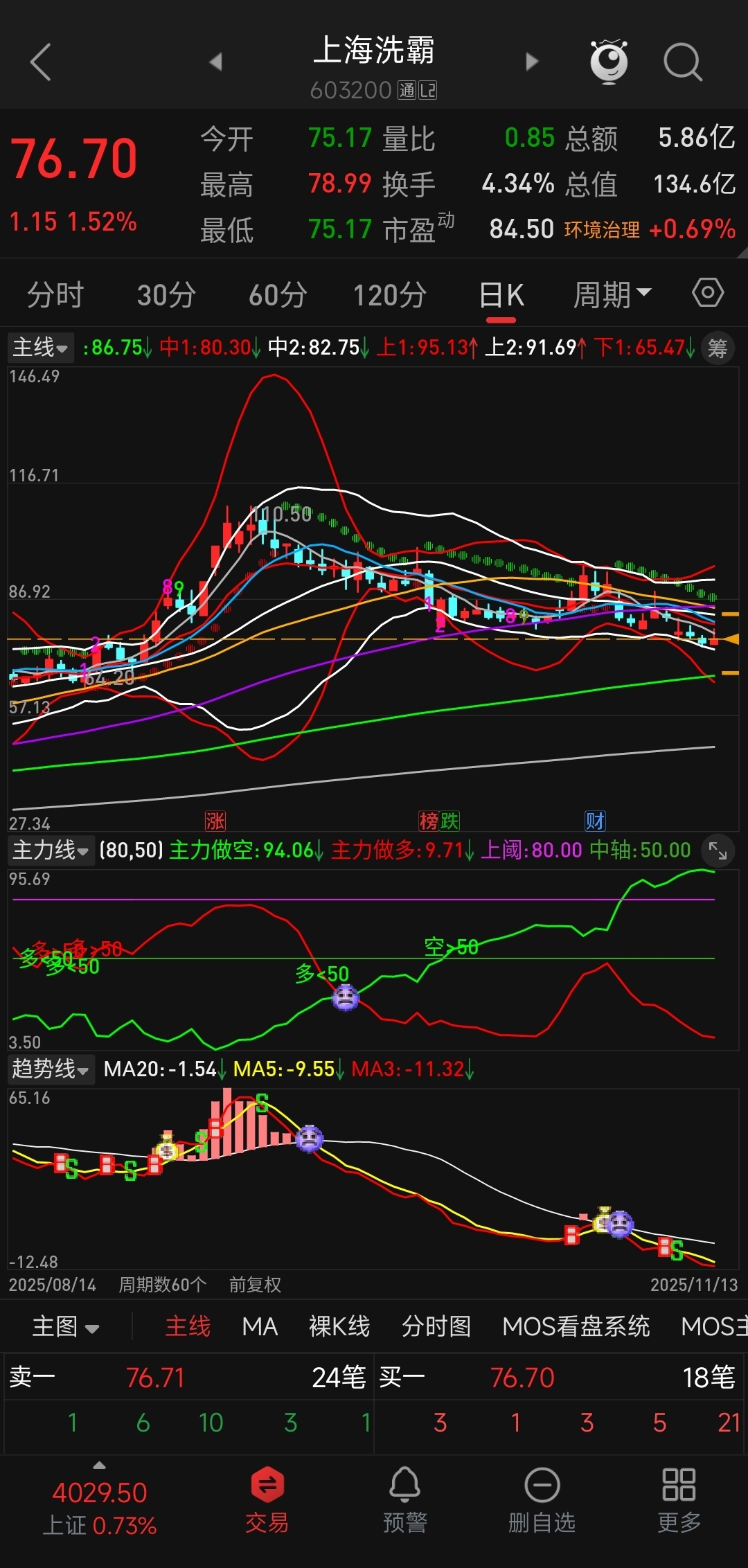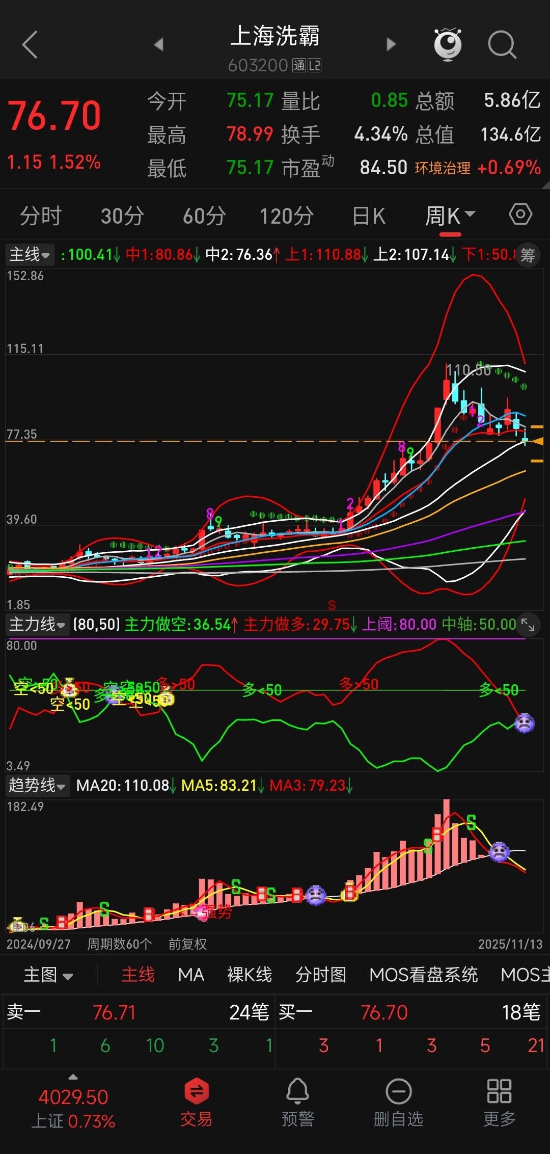 日线向下开口,主力做空线强势维持在天花板之上,趋势线加速下行。周线进一步收口,主