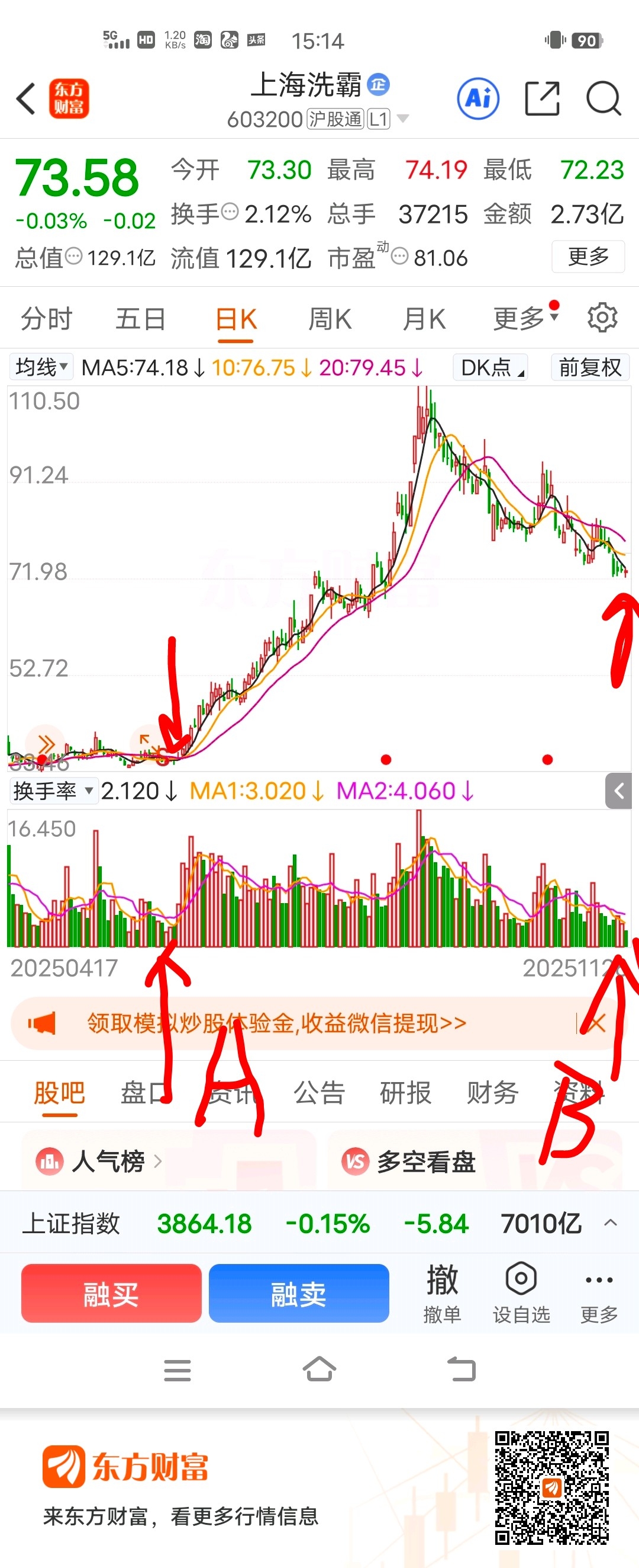 $上海洗霸(SH603200)$ 看到了吗,K线图中A和B两个位置的成交量几乎是一致的,即到了变盘的时刻,看主力资金如何选择!