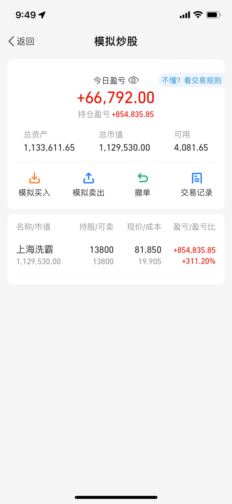$上海洗霸(SH603200)$ 哎,真是错过了,之前一直很看好这个票,但是没有勇气买,我感觉翻本需要很久,我是一个快进快出的,我拿了模拟基金钱买,哎损失几十万 30万模拟吃了311点