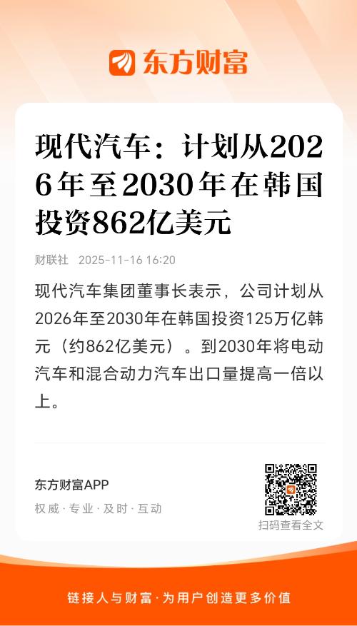 现代汽车集团董事长表示,公司计划从2026年至2030年在韩国投资125万亿韩元(约862亿美元)。到2030年将电动汽车和混合动力汽车出口量提高一倍以上。