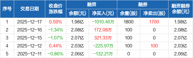 天有为:融资净偿还1010.46万元,融资余额1.98亿元(12-17)