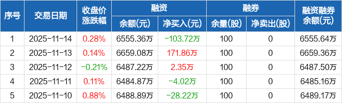 融资方面,当日融资买入714.4万元,融资偿还818.12万元,融资净偿还103.72万元。融券方面,融券卖出0股,融券偿还0股,融券余量100股,融券余额2867元。融资融券余额合计6555.64万元。