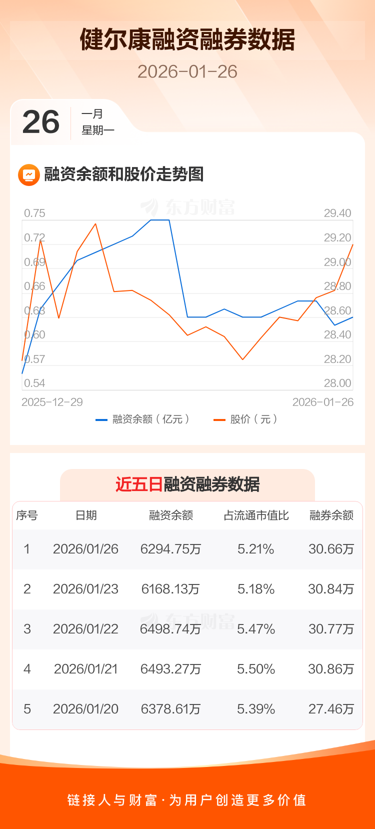 交易所最新数据显示,健尔康于2026年1月26日获融资买入491.07万元,融资偿还364.46万元,当日融资净买入126.61万元。目前,该股融资余额6294.75万,占流通市值比例为5.21%。