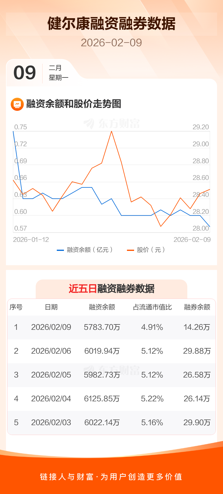 交易所最新数据显示,健尔康于2026年2月9日获融资买入168.32万元,融资偿还404.56万元,当日融资净偿还236.24万元。目前,该股融资余额5783.70万,占流通市值比例为4.91%。