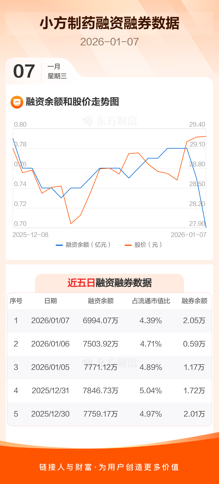 交易所最新数据显示,小方制药于2026年1月7日获融资买入268.22万元,融资偿还778.07万元,当日融资净偿还509.85万元。目前,该股融资余额6994.07万,占流通市值比例为4.39%。