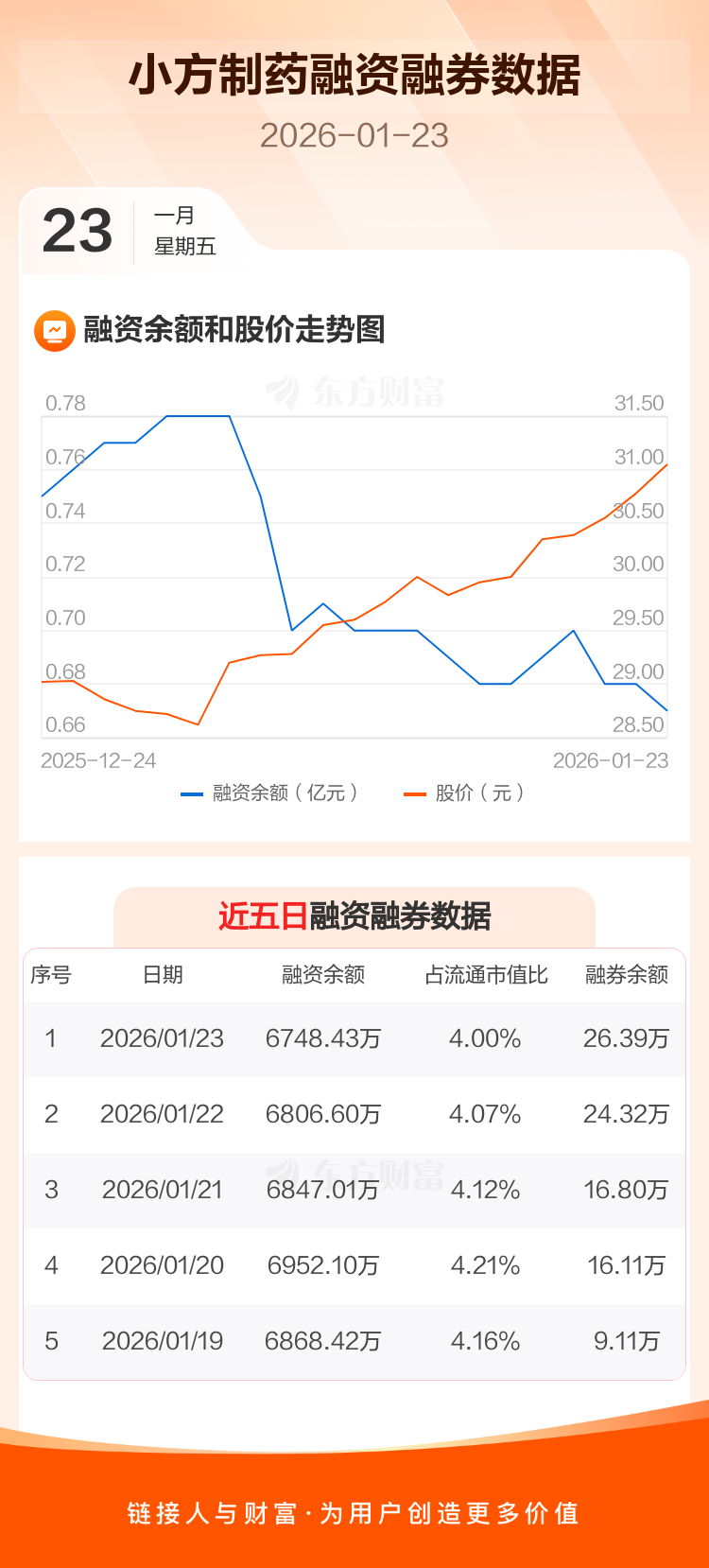 交易所最新数据显示,小方制药于2026年1月23日获融资买入329.03万元,融资偿还387.19万元,当日融资净偿还58.17万元。目前,该股融资余额6748.43万,占流通市值比例为4.00%。