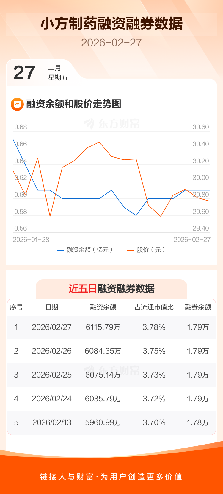 交易所最新数据显示,小方制药于2026年2月27日获融资买入138.75万元,融资偿还107.30万元,当日融资净买入31.45万元。目前,该股融资余额6115.79万,占流通市值比例为3.78%。