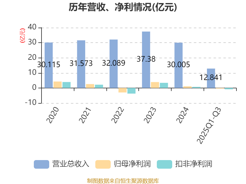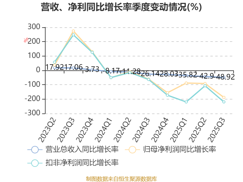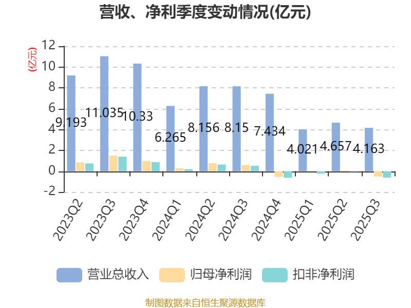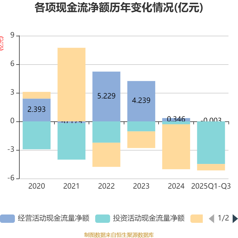 2025年前三季度,公司经营活动现金流净额为-28.36万元,同比增加1128.97万元;筹资活动现金流净额-6737.8万元,同比增加4.23亿元;投资活动现金流净额-4.47亿元,上年同期为-3.24亿元。