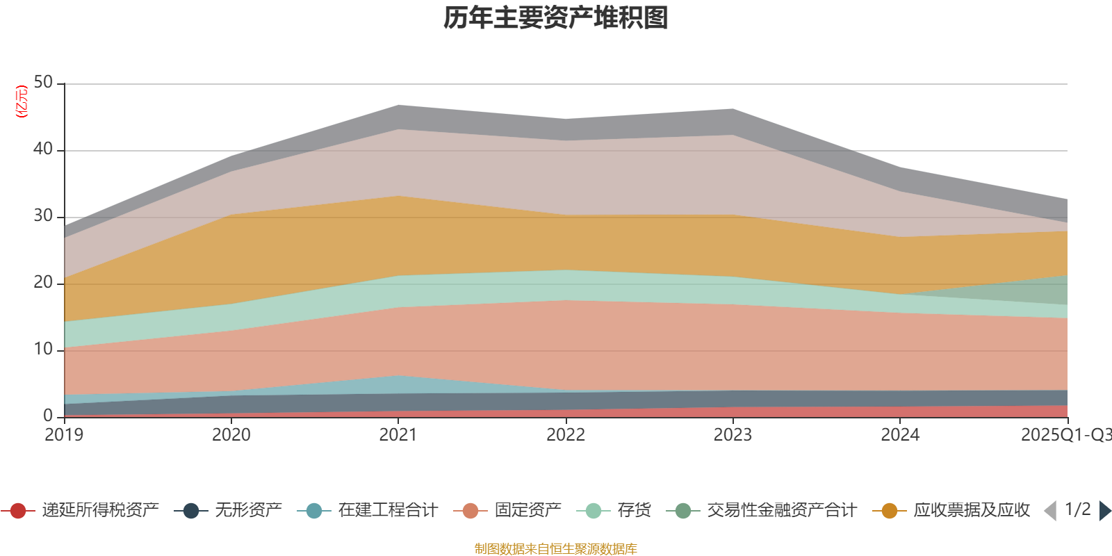 资产重大变化方面,截至2025年三季度末,公司货币资金较上年末减少81.56%,占公司总资产比重下降14.36个百分点;交易性金融资产合计占公司总资产的13.6%,上年末为0;应收票据及应收账款较上年末减少23.1%,占公司总资产比重下降2.71个百分点;固定资产较上年末减少7.33%,占公司总资产比重上升1.96个百分点。