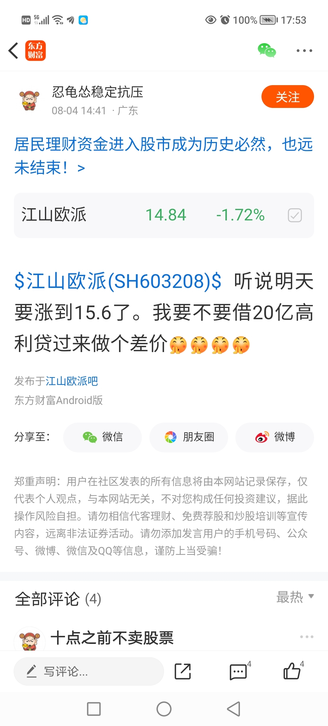 温馨提示: 1.根据《证券法》规定,禁止编造、传播虚假信息或者误导性信息,扰乱证券市场;2.用户在本社区发表的所有资料、言论等仅代表个人观点,与本网站立场无关,不对您构成任何投资建议。用户应基于自己的独立判断,自行决定证券投资并承担相应风险。《东方财富社区管理规定》