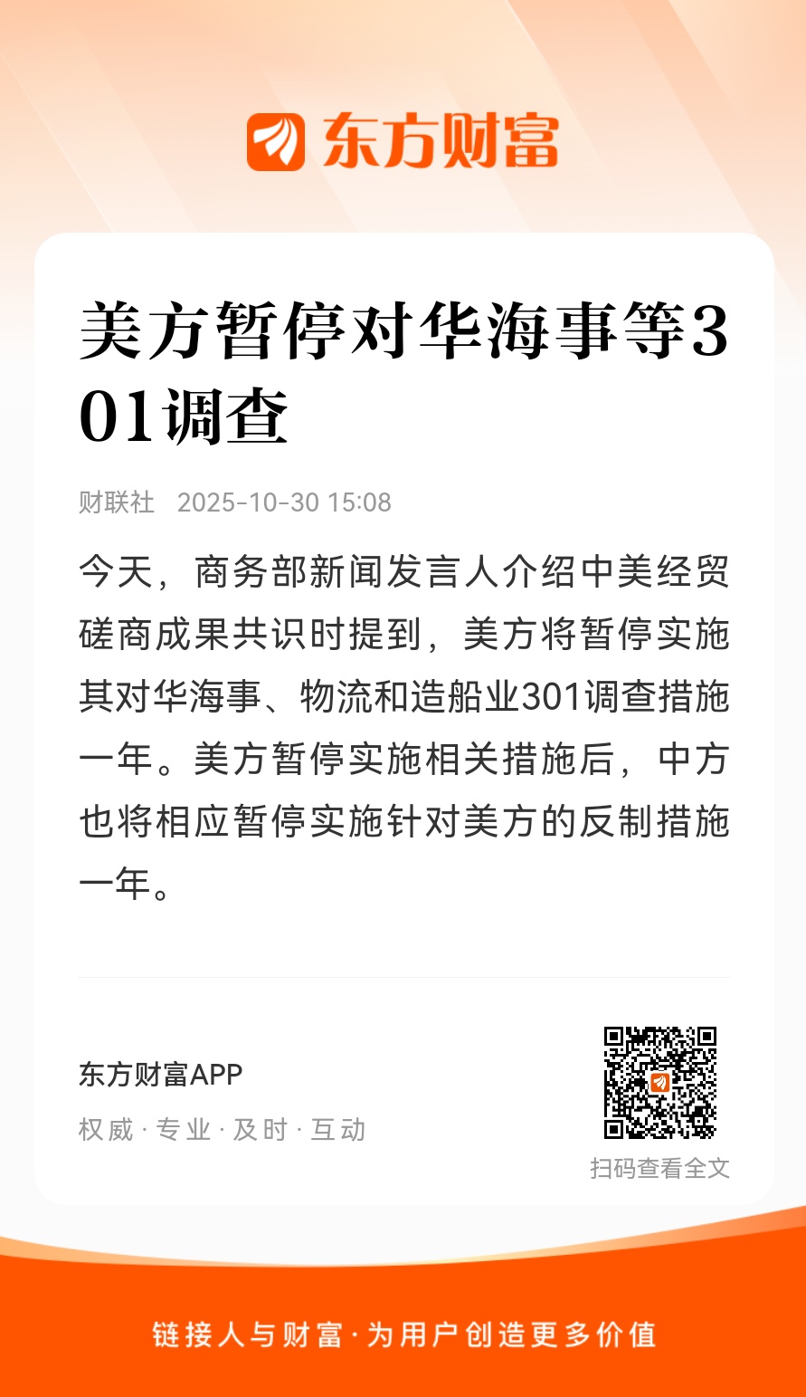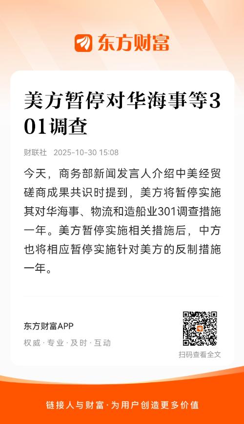 今天,商务部新闻发言人介绍中美经贸磋商成果共识时提到,美方将暂停实施其对华海事、物流和造船业301调查措施一年。美方暂停实施相关措施后,中方也将相应暂停实施针对美方的反制措施一年。