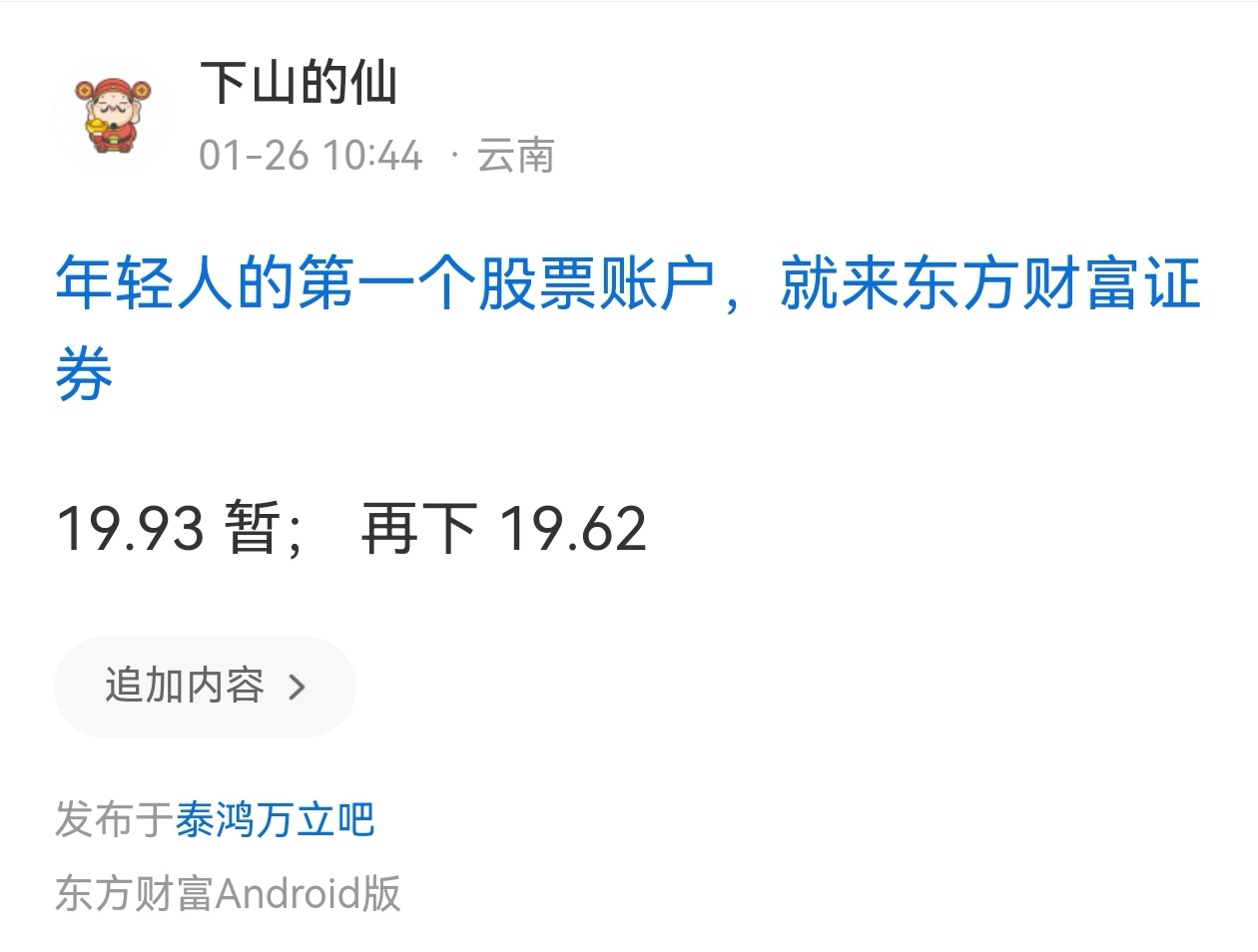 温馨提示: 1.根据《证券法》规定,禁止编造、传播虚假信息或者误导性信息,扰乱证券市场;2.用户在本社区发表的所有资料、言论等仅代表个人观点,与本网站立场无关,不对您构成任何投资建议。用户应基于自己的独立判断,自行决定证券投资并承担相应风险。《东方财富社区管理规定》