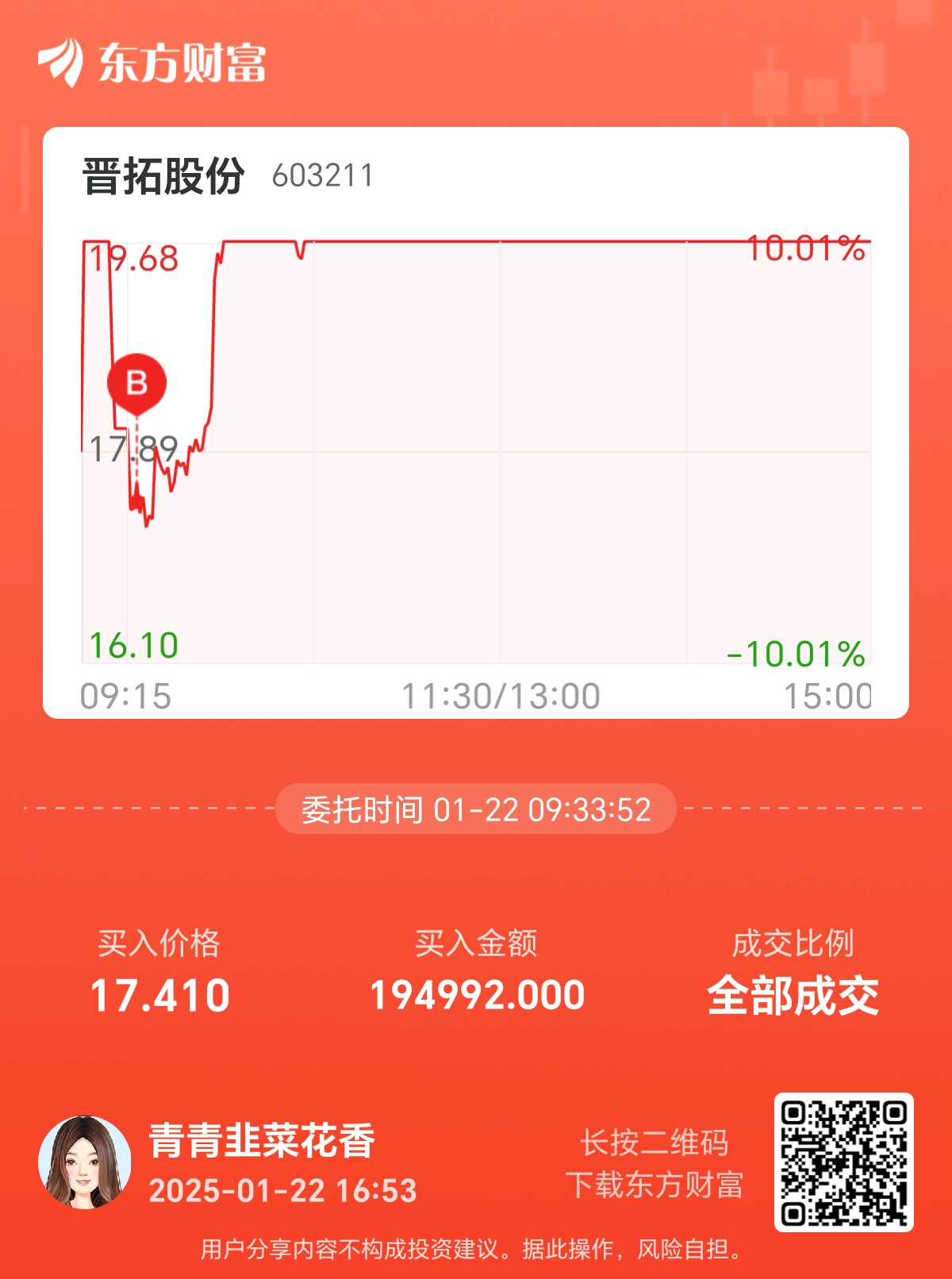 温馨提示: 1.根据《证券法》规定,禁止编造、传播虚假信息或者误导性信息,扰乱证券市场;2.用户在本社区发表的所有资料、言论等仅代表个人观点,与本网站立场无关,不对您构成任何投资建议。用户应基于自己的独立判断,自行决定证券投资并承担相应风险。《东方财富社区管理规定》