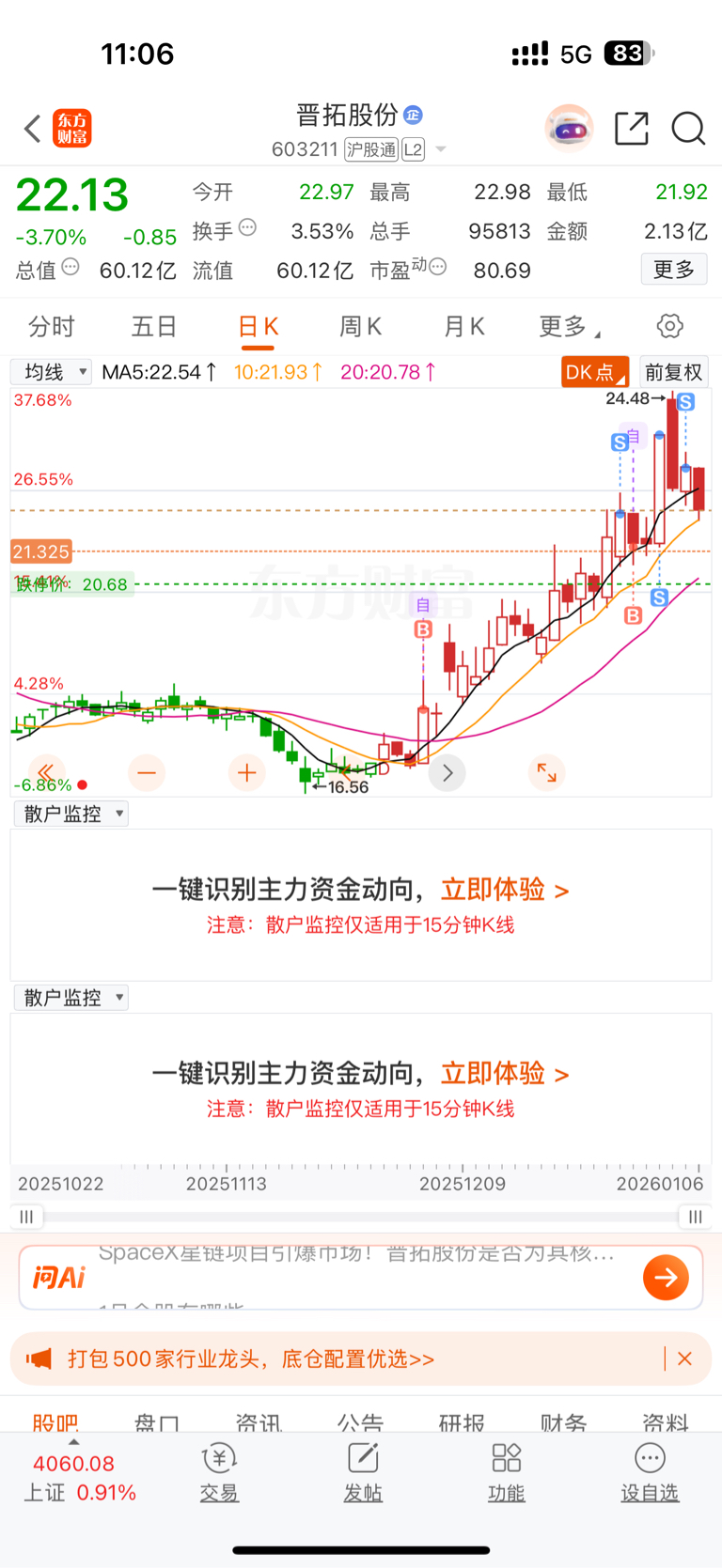 $晋拓股份(SH603211)$ 估计会回调10~25个点,不一定对,我个人觉得应该要出来一下了,后期连板是肯定的,但从现在的形式来看是先回调再横盘几天,然后再拉板,但不会太多板,主力目前来看并没有拉板的意愿,我是在第一个B点全仓进的