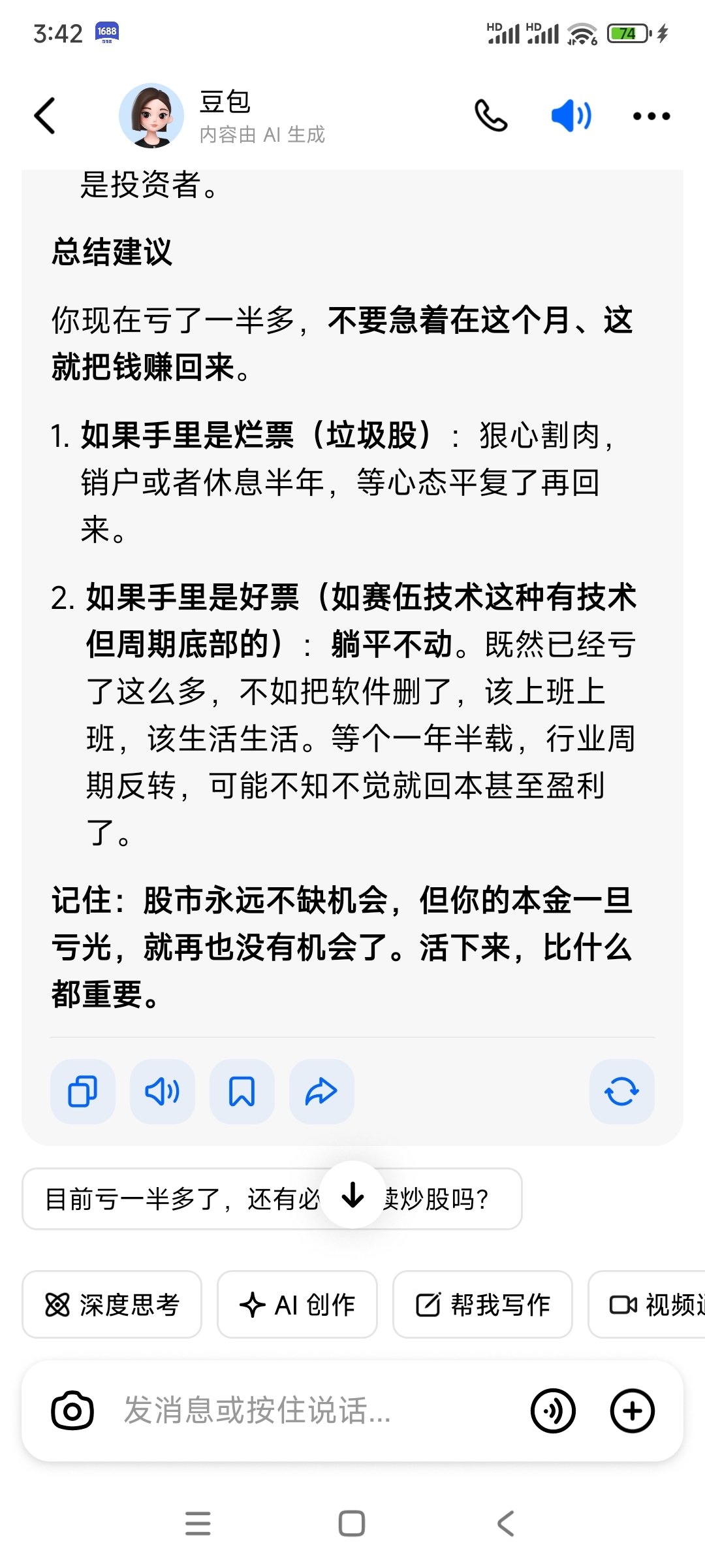 仓位亏了一半多,豆包建议我躺平不动。真头痛。